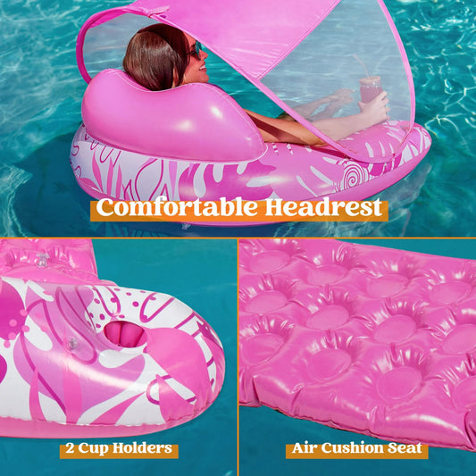 Syncfun Pool Float with Canopy, XL Pink Pool Lounge Chairs with Cup Holders, Floating Pool Chair for Adults, Inflatable Pool Floatie with Headrest for Summer Pool Party