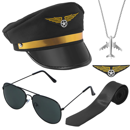 Joyfy 5 Pcs Halloween Pilot Captain Costume Accessories Set with Aviator Sunglasses,Tie,Pilot Hat,Wings Patch and Necklace,Cosplay Accessories for Kids and Adults Dress Up