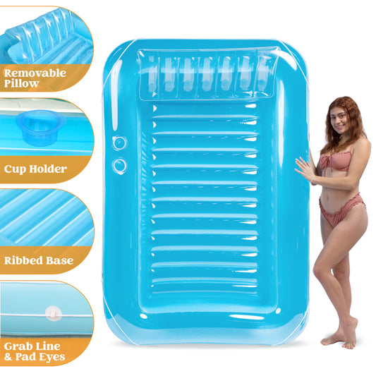 Sloosh Inflatable Tanning Pool Lounger Float, 70" x 46" Large Suntan Tub with Pillow, Water Raft Floatie For Kids & Adults, Blue