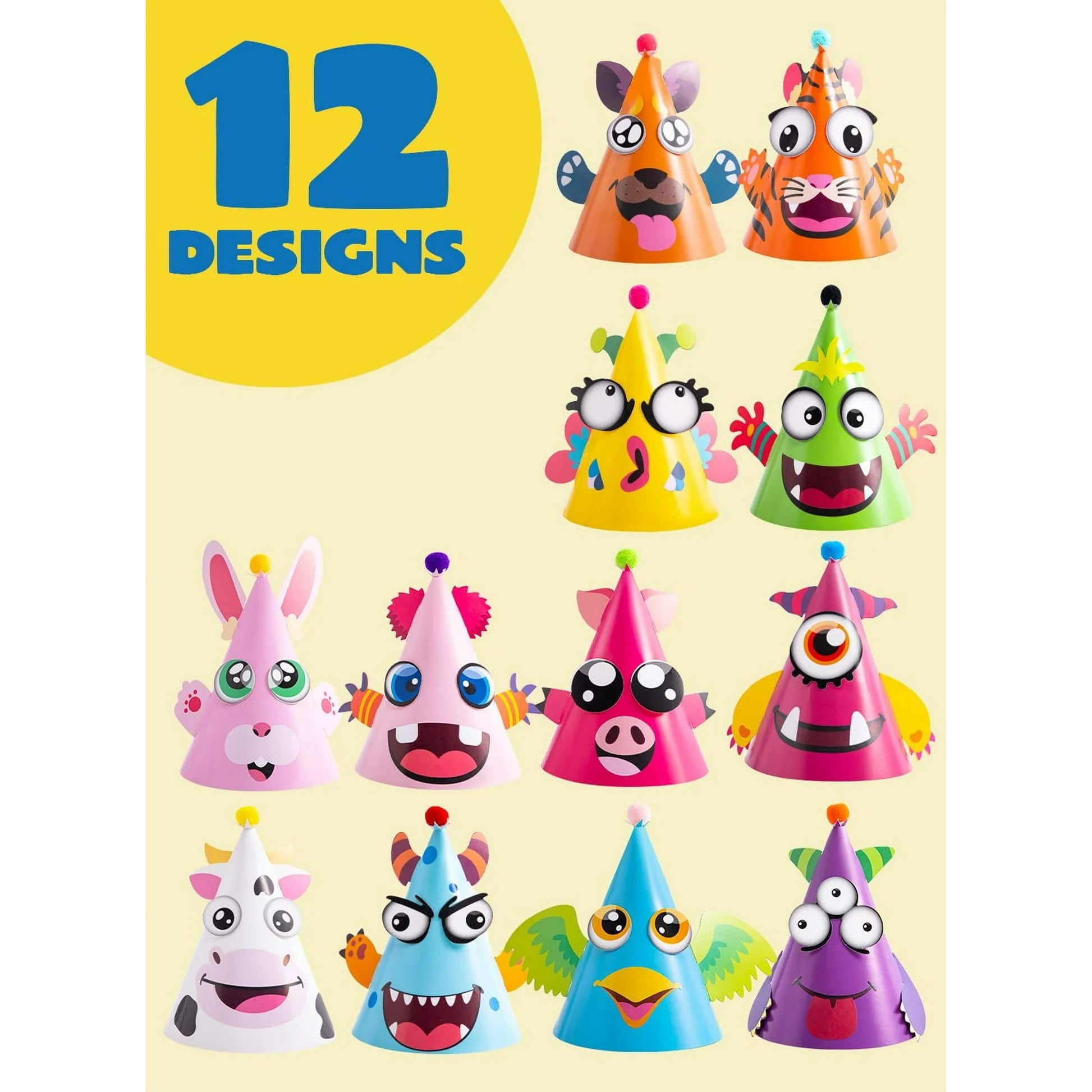 12 Sets Party Hats for Kids Birthday Party Games Craft Activities, Cute Animal Theme Birthday Hats Activity Kits with Stickers for Kids Holiday Party Favors