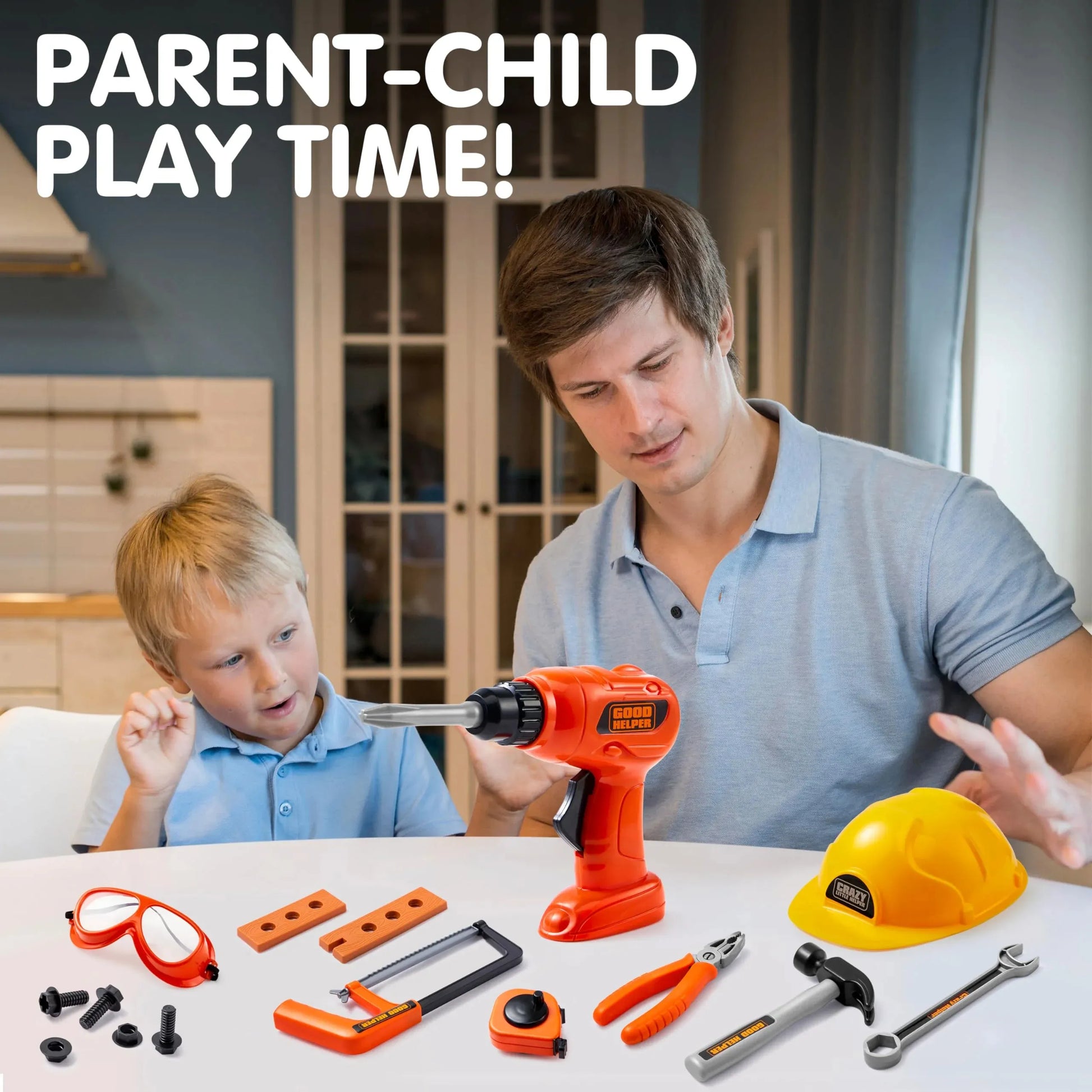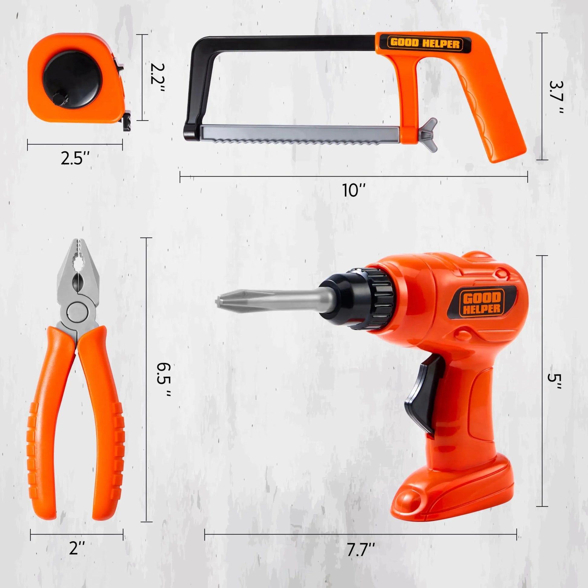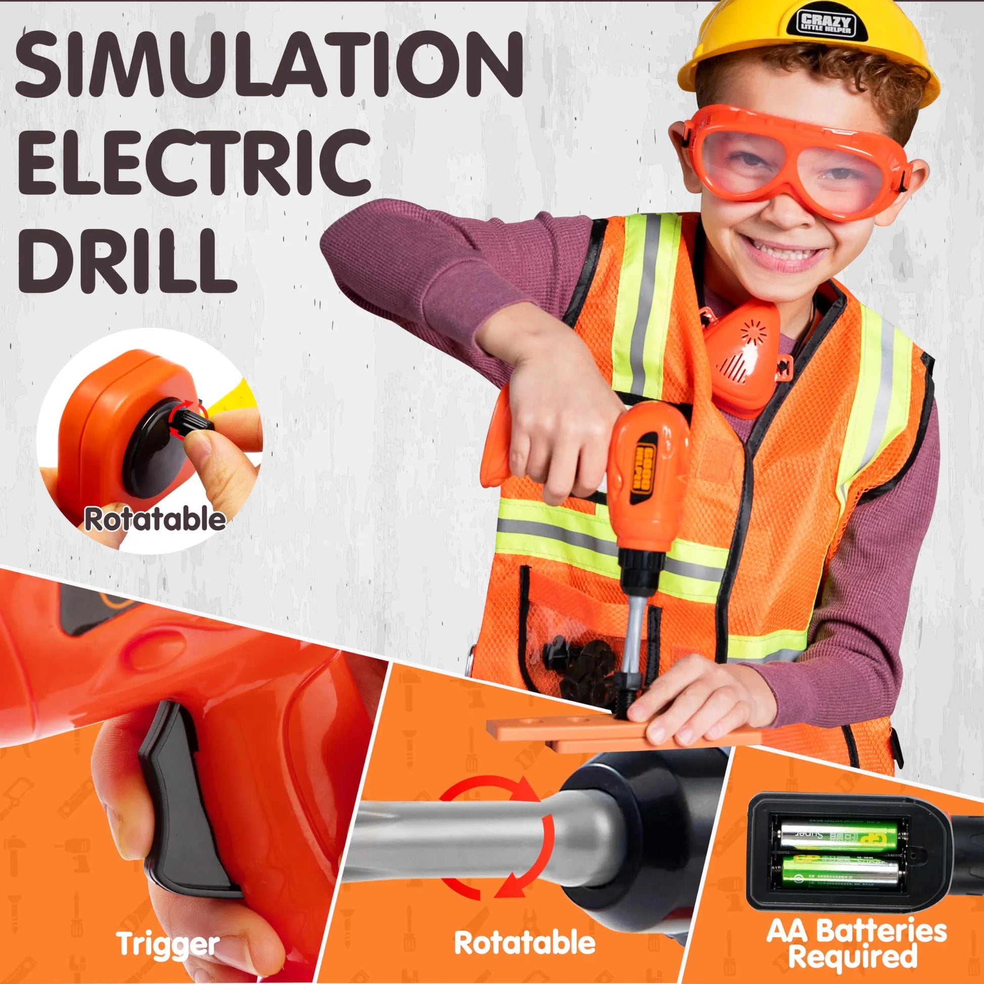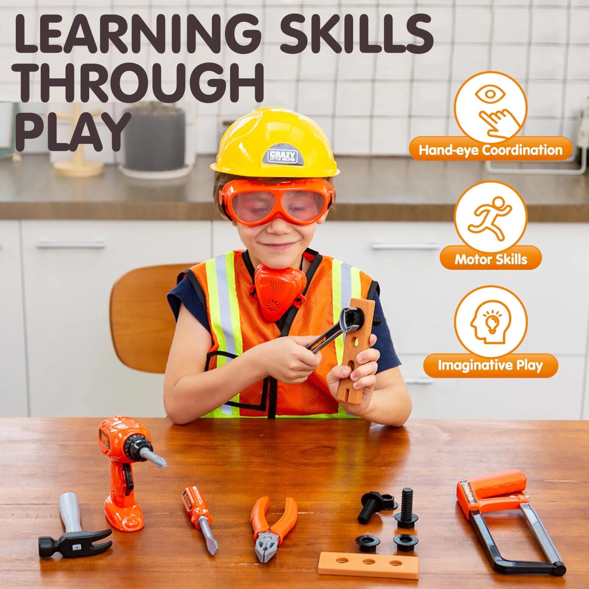 Syncfun 19 Pcs Kids Toy Tool Set, Pretend Play Toddler Tool Workbenches include Orange Vest, hard hat, goggles, mask, hammer, spanner, plier, screw, nut, screw driver and plate with holes for boy girl birthday gift outdoor preschool ages 3, 4, 5, 6, 7 years old. Provides early STEM skills, shape recognition, problem-solving, communication skills, social skills, creativity, handwriting, reading, playing and life skills.