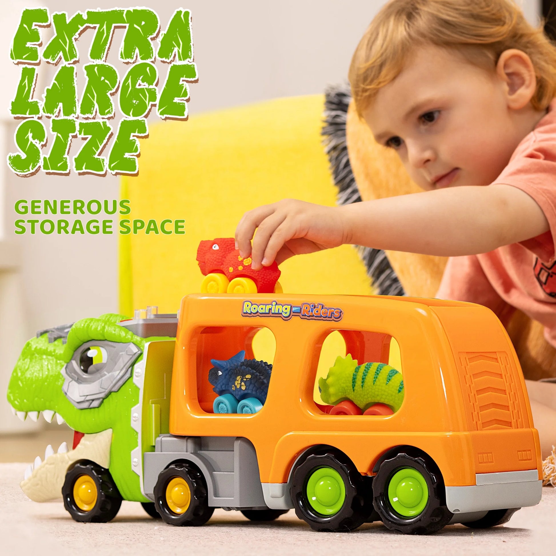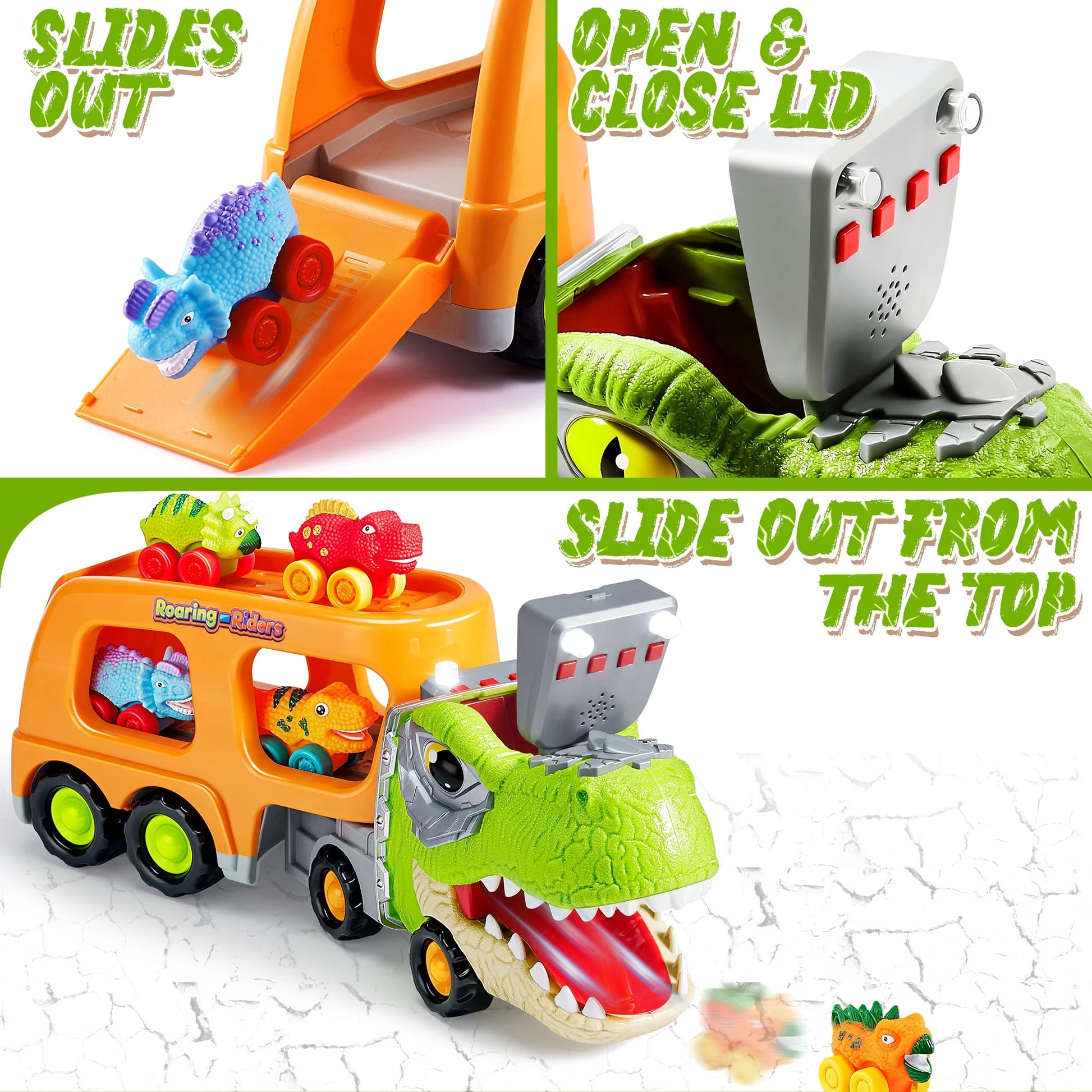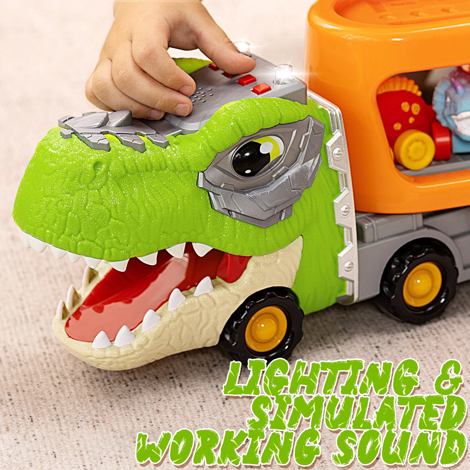 - SYNCFUN dinosaur truck doubles as a storage unit, capable of comfortably housing all six mini dinosaur cars across two decks.