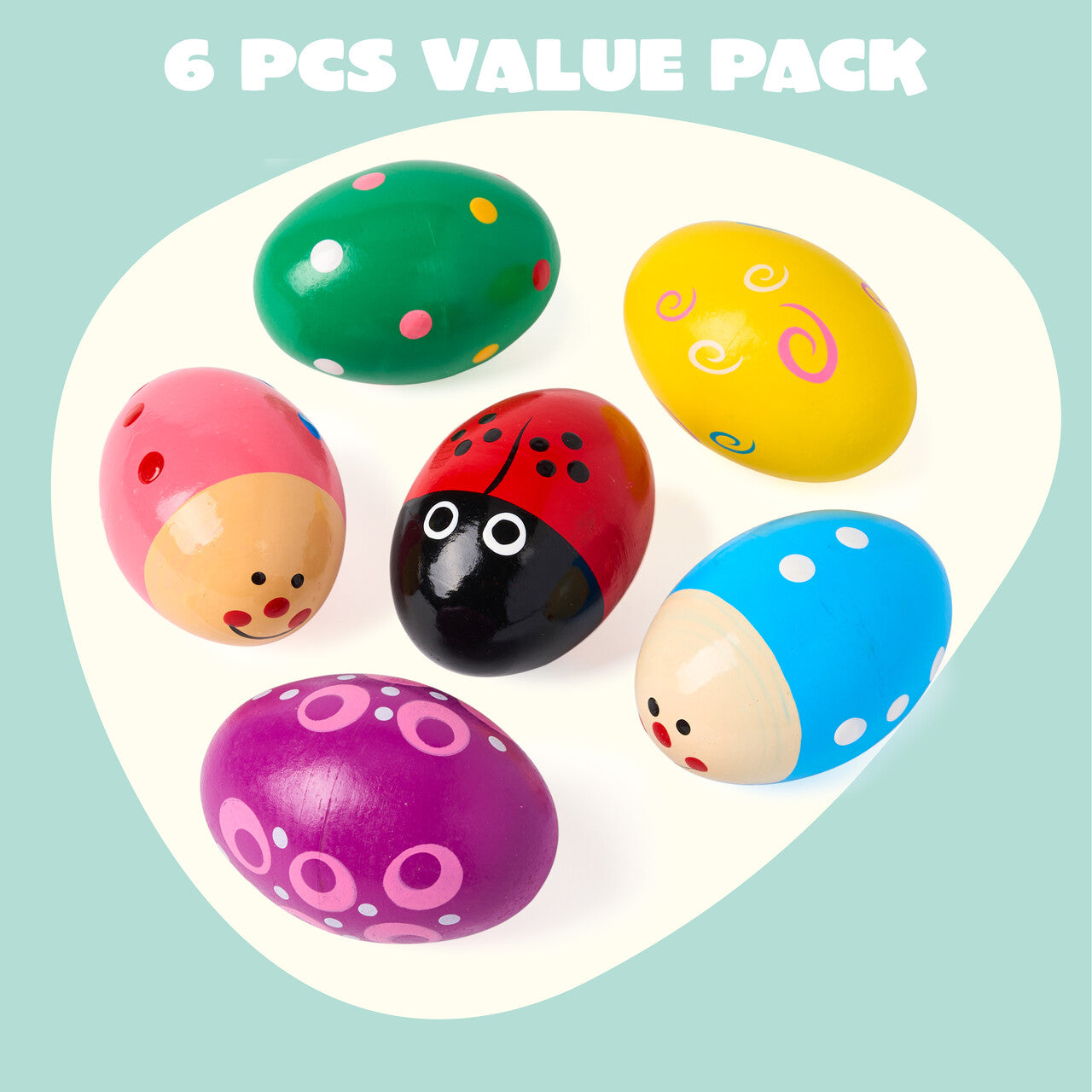 - Wooden Easter Egg Shakers includes 6 Assorted Bright Color and Painted Designs.Shake, rattle, and roll into Easter joy! Each Maracas Egg Shaker is filled with little beads that produce delightful sounds when shaken. Beneficial as kids and toddlers develop a sense of rhythm in a playful way.