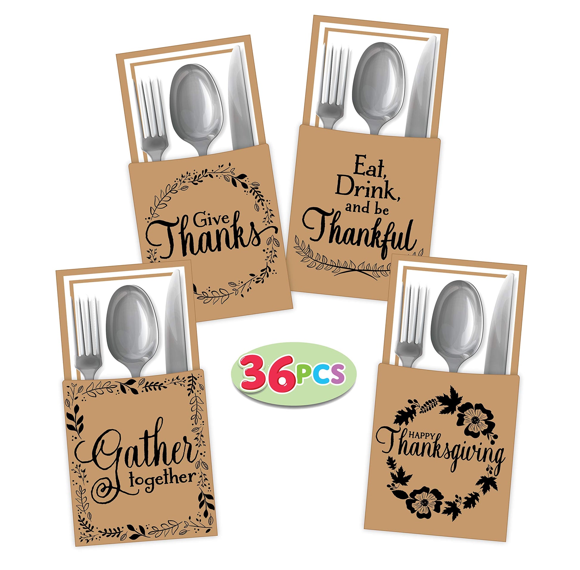 - UNIQUE DESIGN & EASY TO USE. If you’re hosting a Thanksgiving feast you’re going to need some things. Because hosting Thanksgiving dinner is not for the faint of heart. Everyone needs these cute little cutlery holders. It’s a nice take home gift as well. Or at the least they are recyclable.