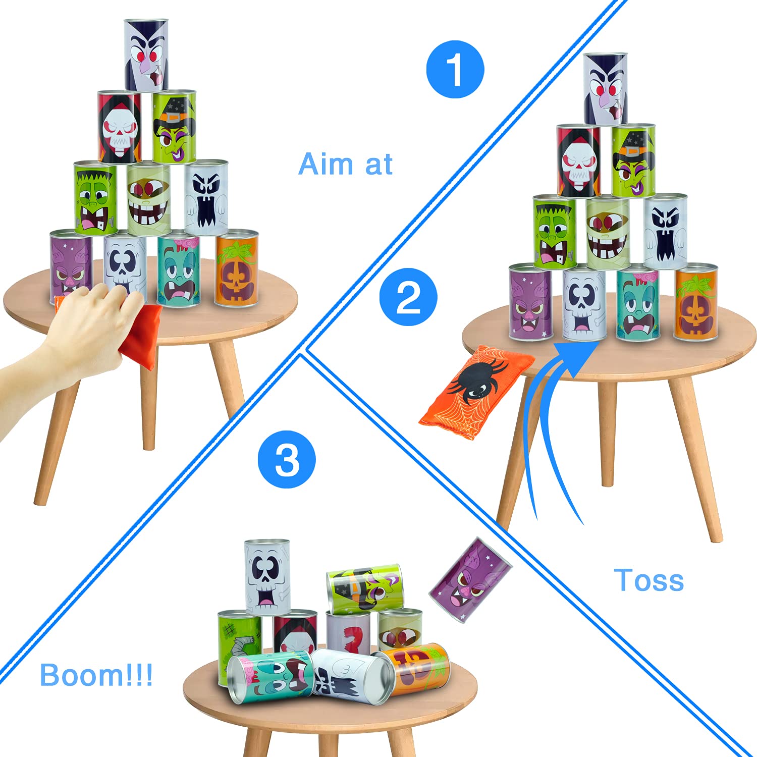 - Unique Design & Easy To Use. This classic carnival can bean bag toss game features in Halloween style design and carnival toss game. Harder than it looks. Kids & adults will have a lot of fun from stacking the cans up and knocking them down with the bean bags.