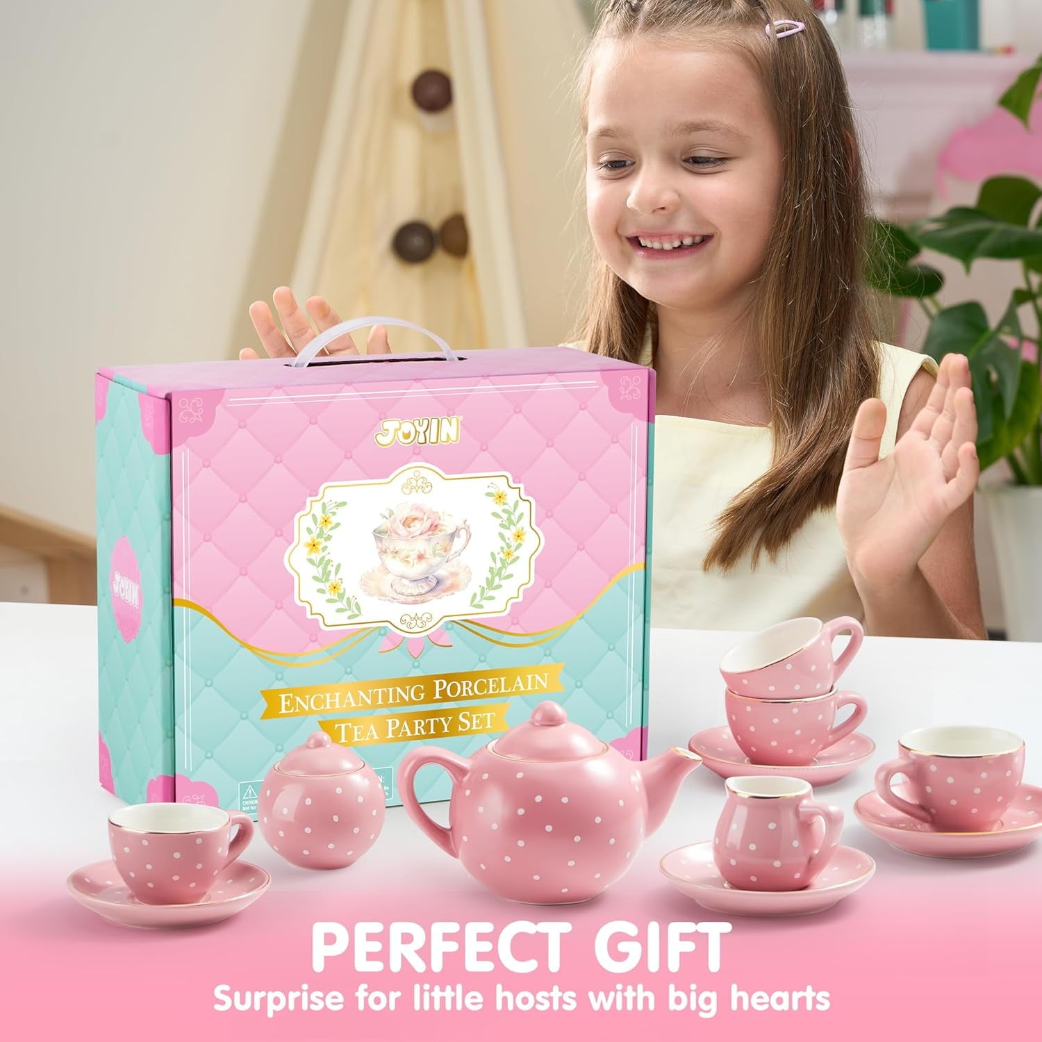 Porcelain Tea Set for Girls, 13 PCS Pink Childs Tea Party Set, Pretend Play Toys with Teapot, Cups, Saucers & Carrying Case, Ideal for Toddlers Kids Christmas Birthday Gifts Ages 3 4 5