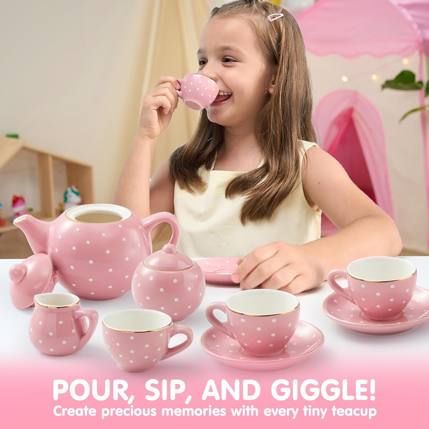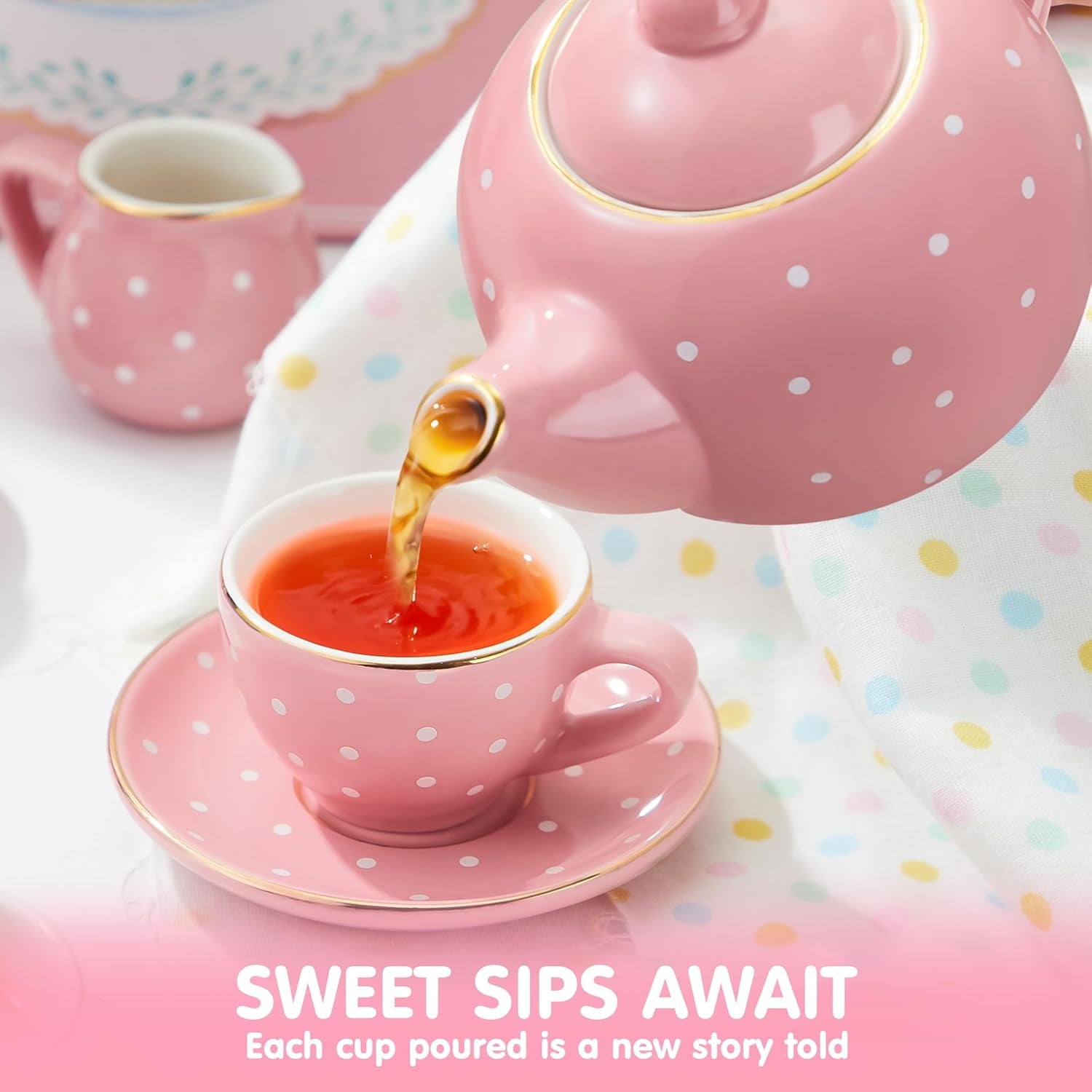 âăBeautiful and Enchanting Designă-Â Hand-glazed with pink polka dots and gold detailing, this elegant tea set boasts sophisticated craftsmanship, bringing joy and happiness to your child's playtime