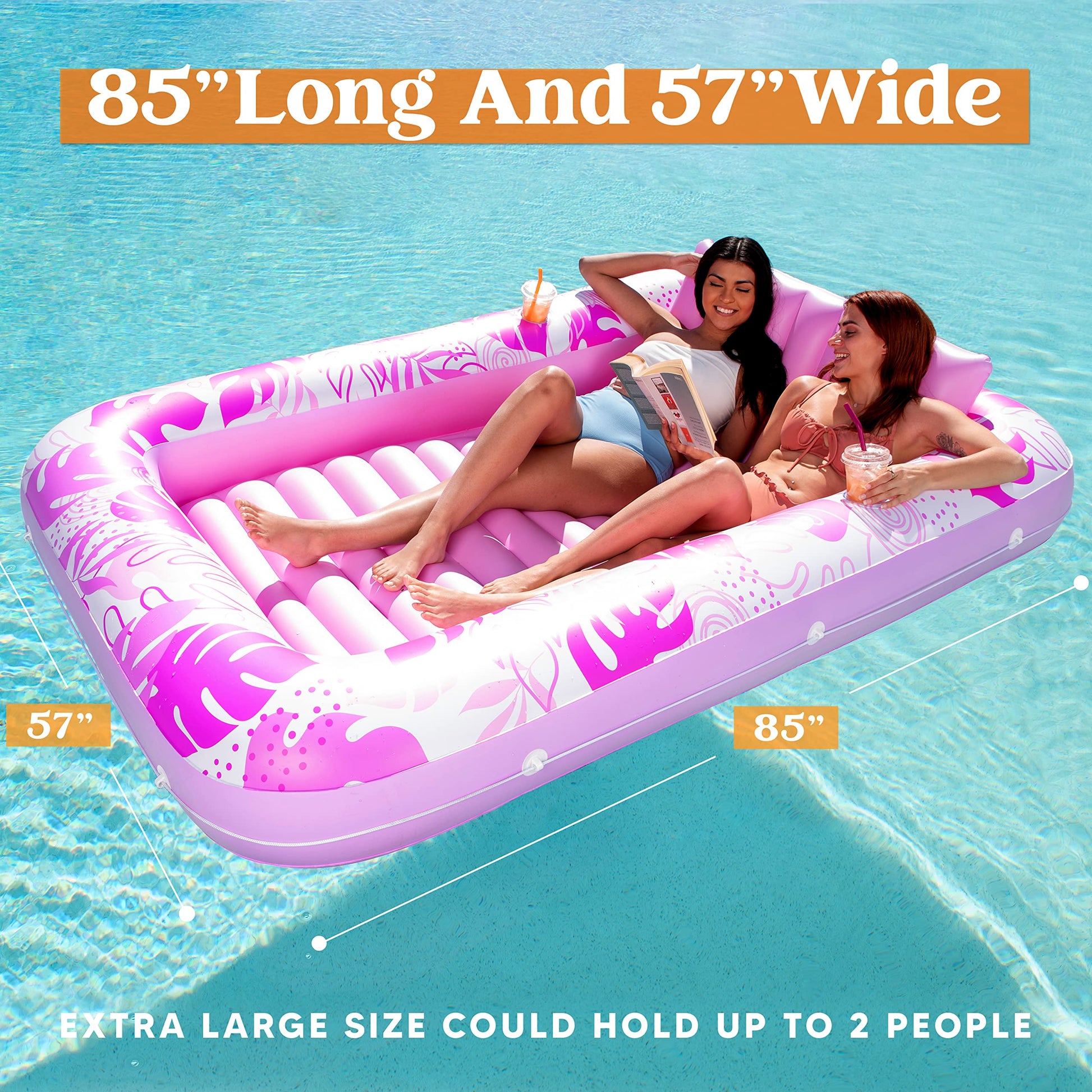 The Sloosh Inflatable Tanning Pool Lounger Float is an extra-large, 85" x 57" pool float designed for adults and kids. Made of thick, heavy-duty, and UV-resistant PVC , it can hold up to 2 people. The float features a removable pillow and ribbed air cushion base for added comfort and support . It has two 3D cup holders and integrated pad eyes with a wrap-around grab line for maneuverability. The float can be used as a suntan tub, personal pool, pool float, or kids' ball pit pool, and can be filled with water to prevent overheating. It's perfect for relaxing and enjoying the sun.