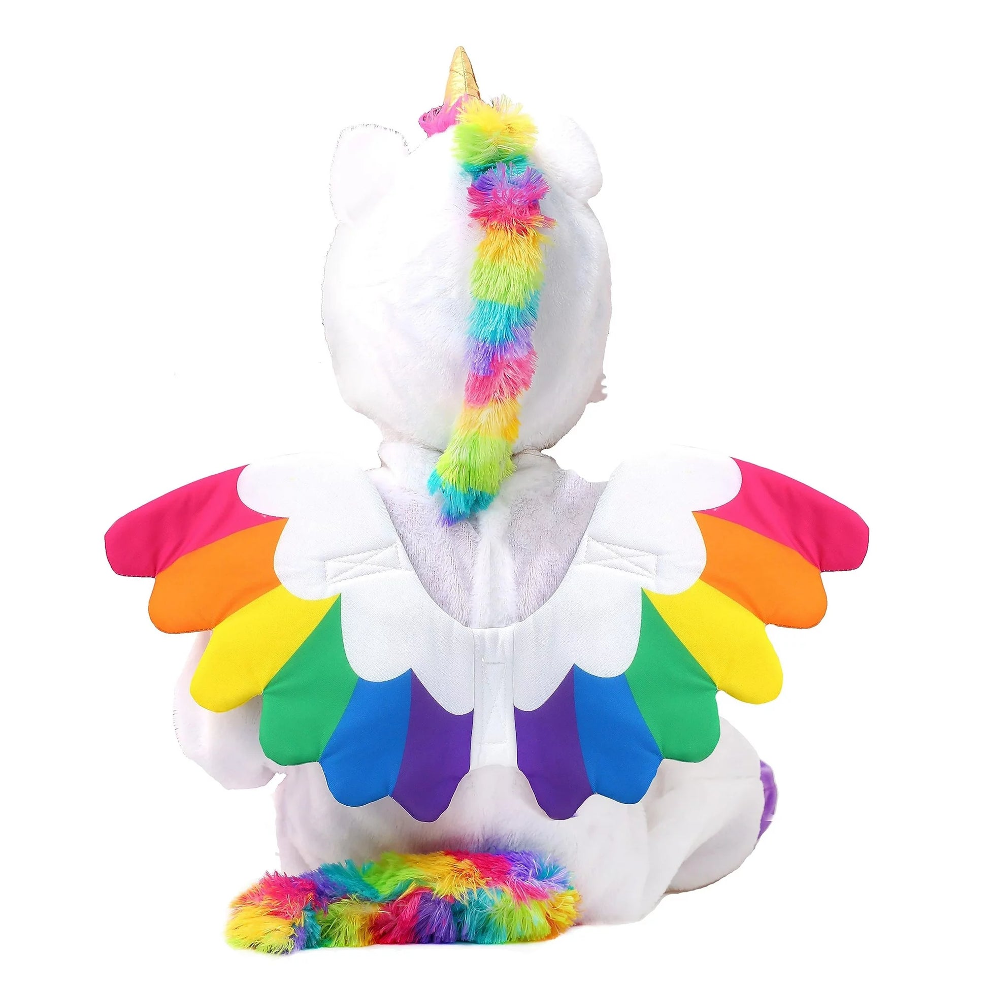 - MATERIAL: 100% Polyester. White and Rainbow Star Unicorn Bodysuit and Costume Deluxe Set. Super Durable and Adorable, Higher Quality. The Baby Unicorn Costume with Wings and Star Wand are Machine Washable and can stand Repeated Cleanings without losing shape.