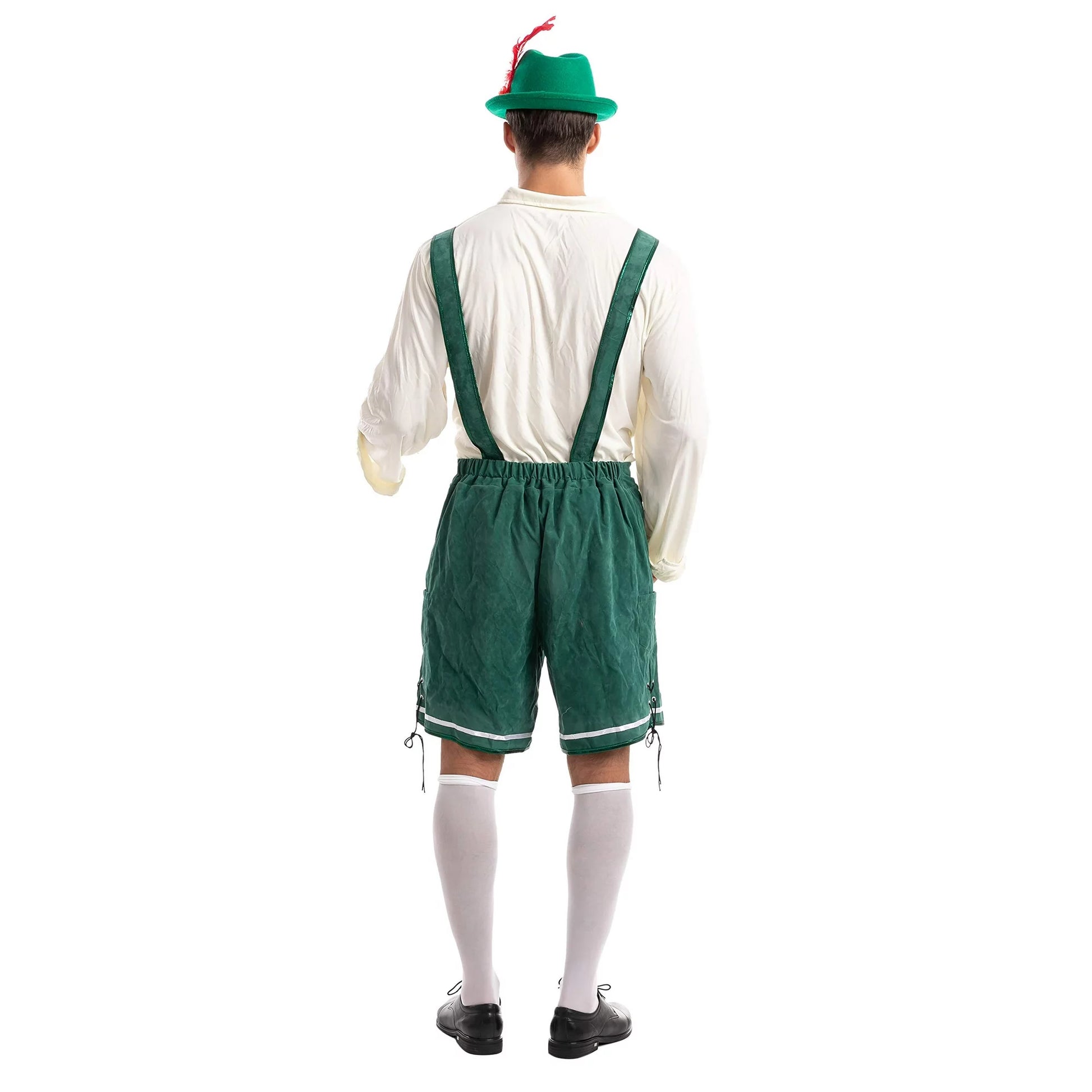 - Great Value Package: Men's Green Oktoberfest Lederhosen Costume, includes a traditional embroidered German design Oktoberfest costume (with suspenders and detachable bib), a pullover with tie-neck collar, a pair of knee-high socks and a German Alpine hat (beer mug not included).