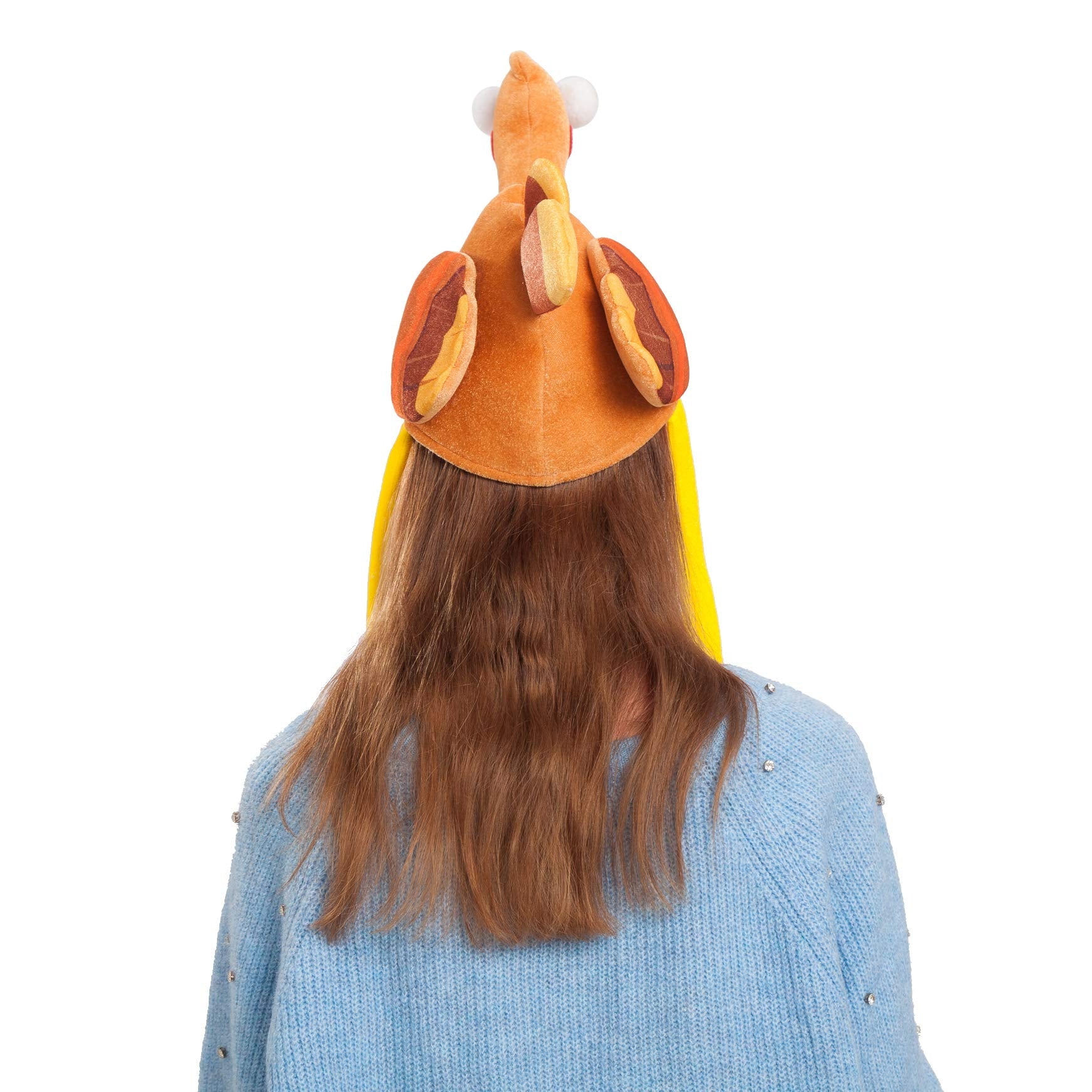 - One Size Funny Thanksgiving Turkey/Gobbler Hat features a Plush Brown Full Bodied Turkey Hat with Long Yellow Legs Hanging Down and Long Neck.