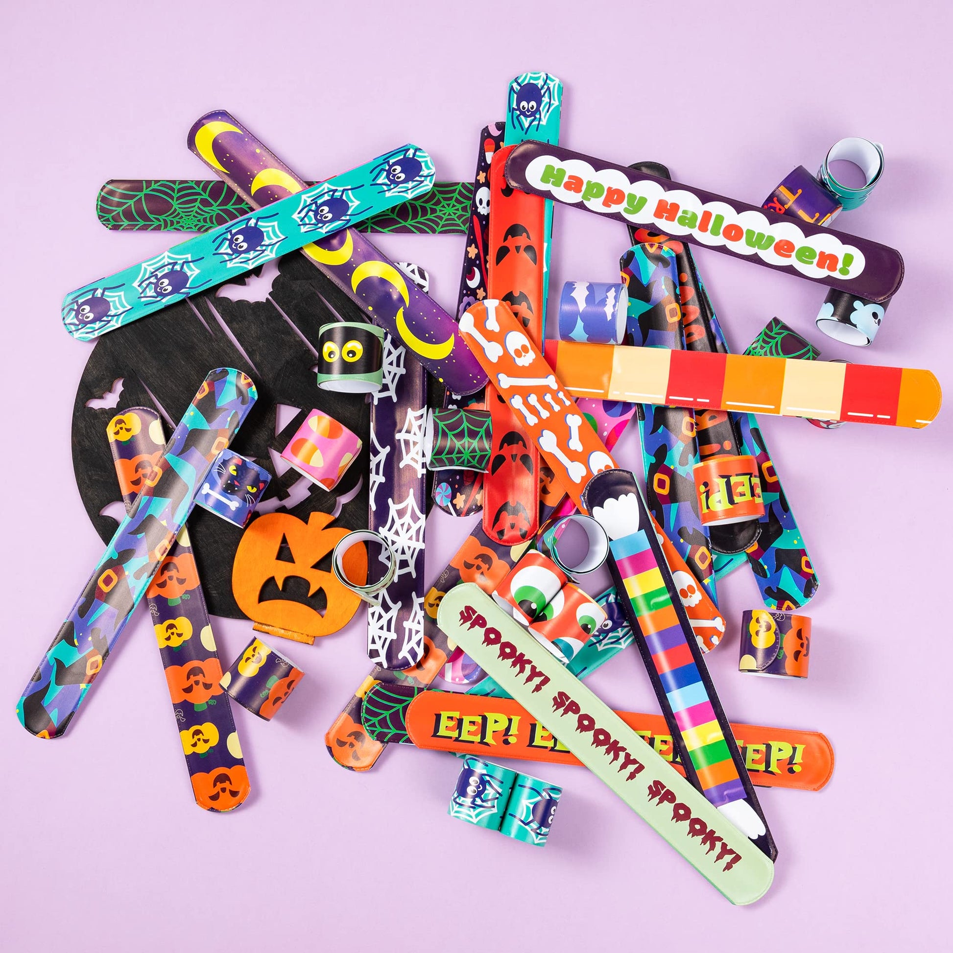 - The slap bracelets set includes 120pcs Halloween Slap Bracelets. It includes 120Pcs Halloween pat ring wristband in 24 different style,such as ghost, pumpkins, witches, bats, mummies, vampires, black cats, etc.many kinds of pattern,everyone is free to choose the pattern they like.