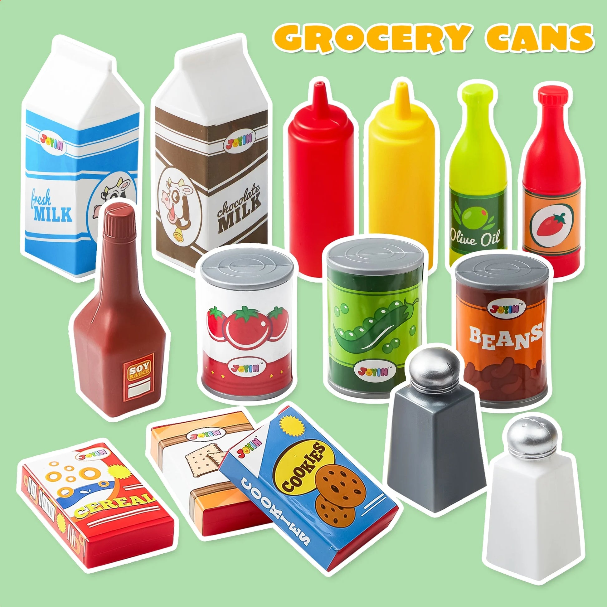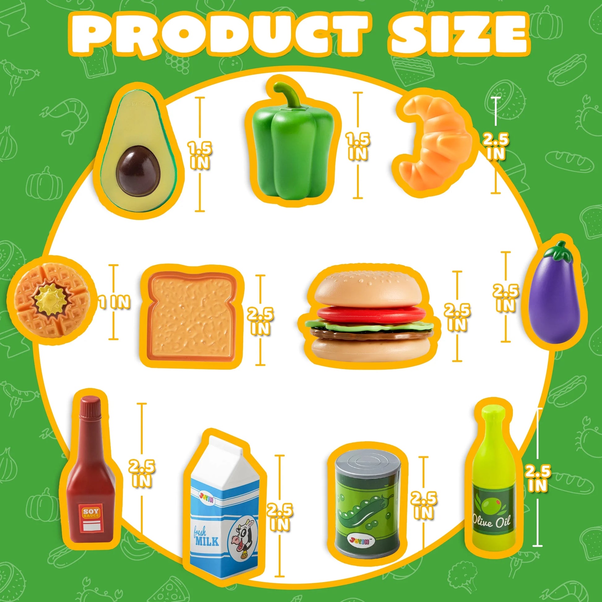 - This play food set for kids kitchen includes 135 pcs and 50+ different food items. Includes fruits, vegetables, food can, dessert, sauce bottle, dish wash and so on.