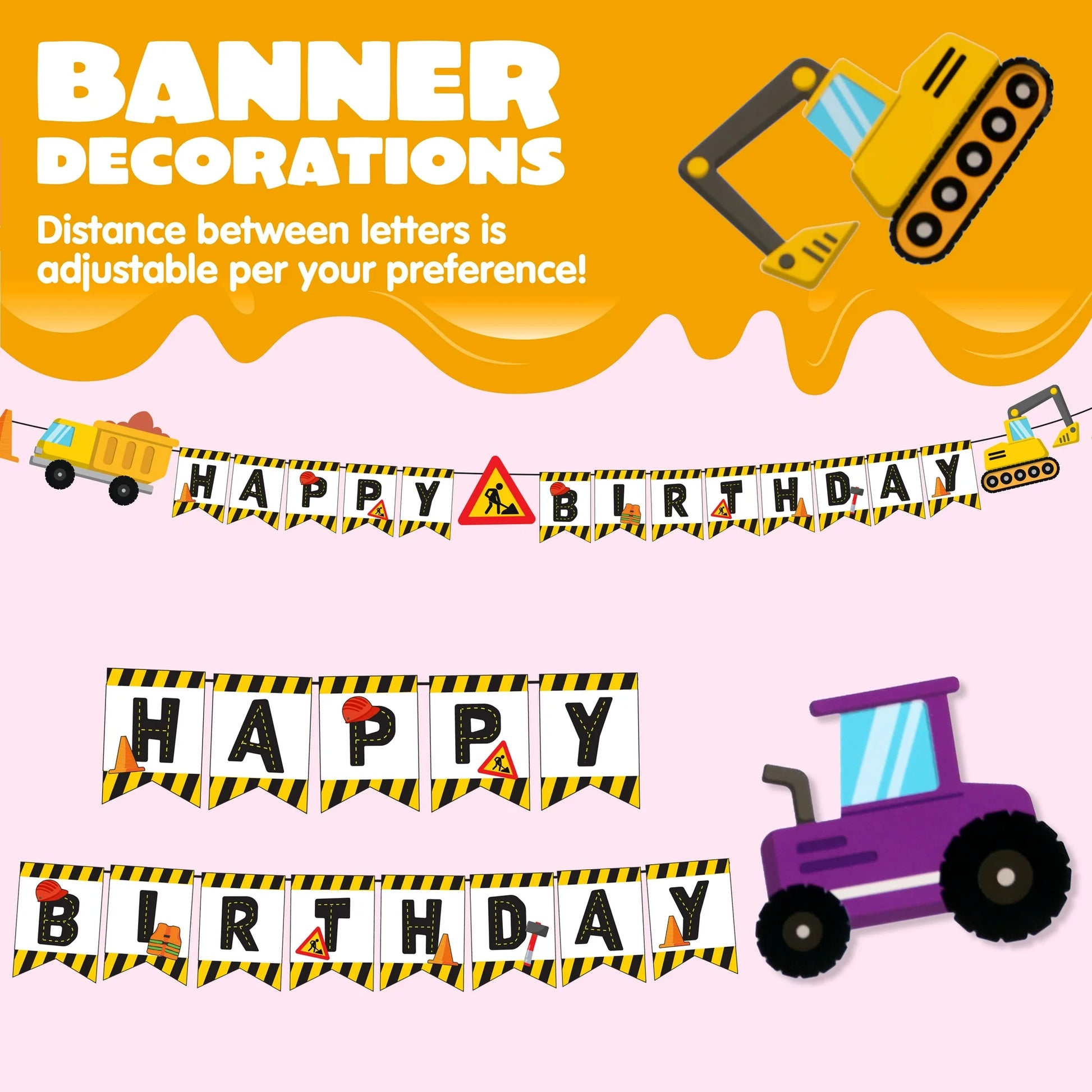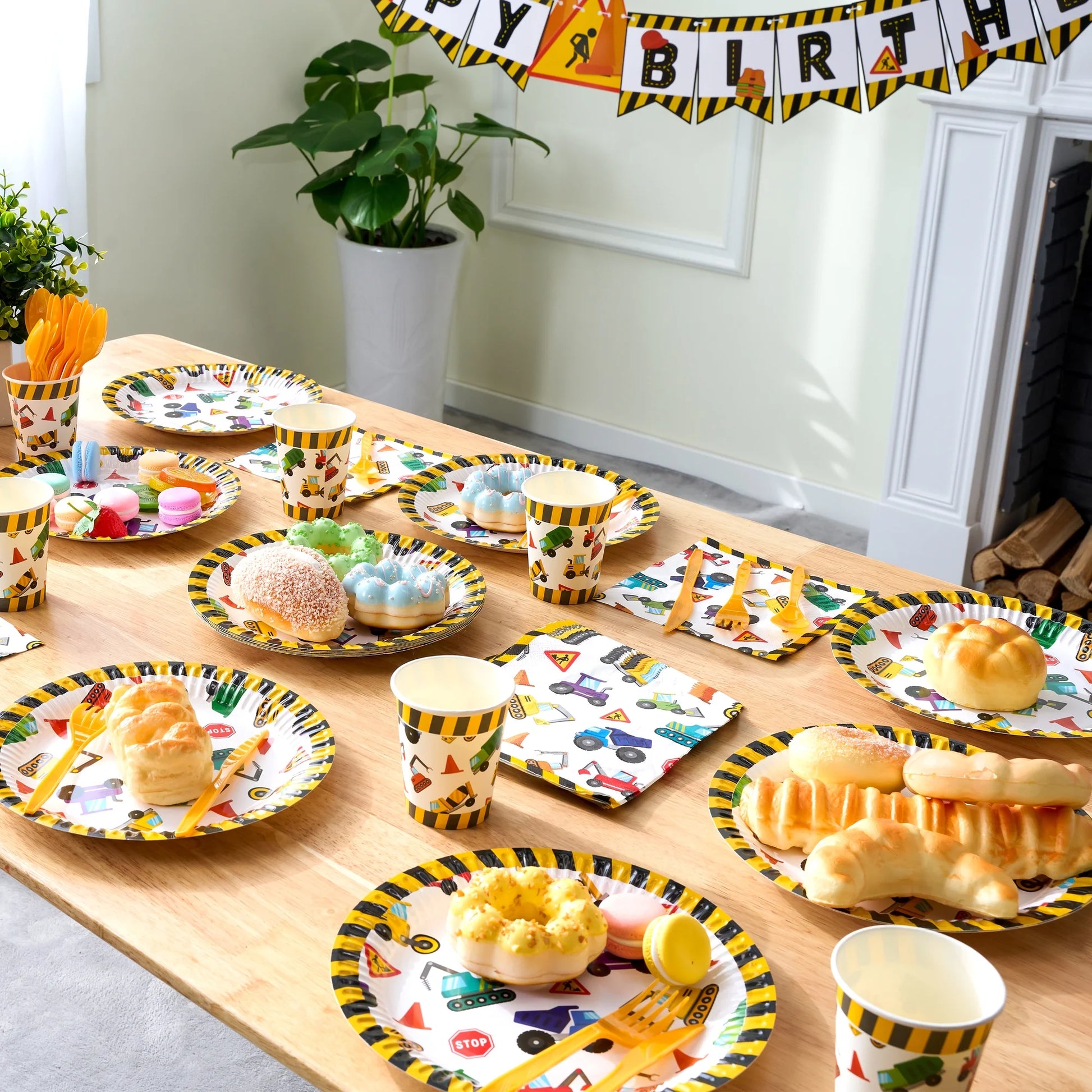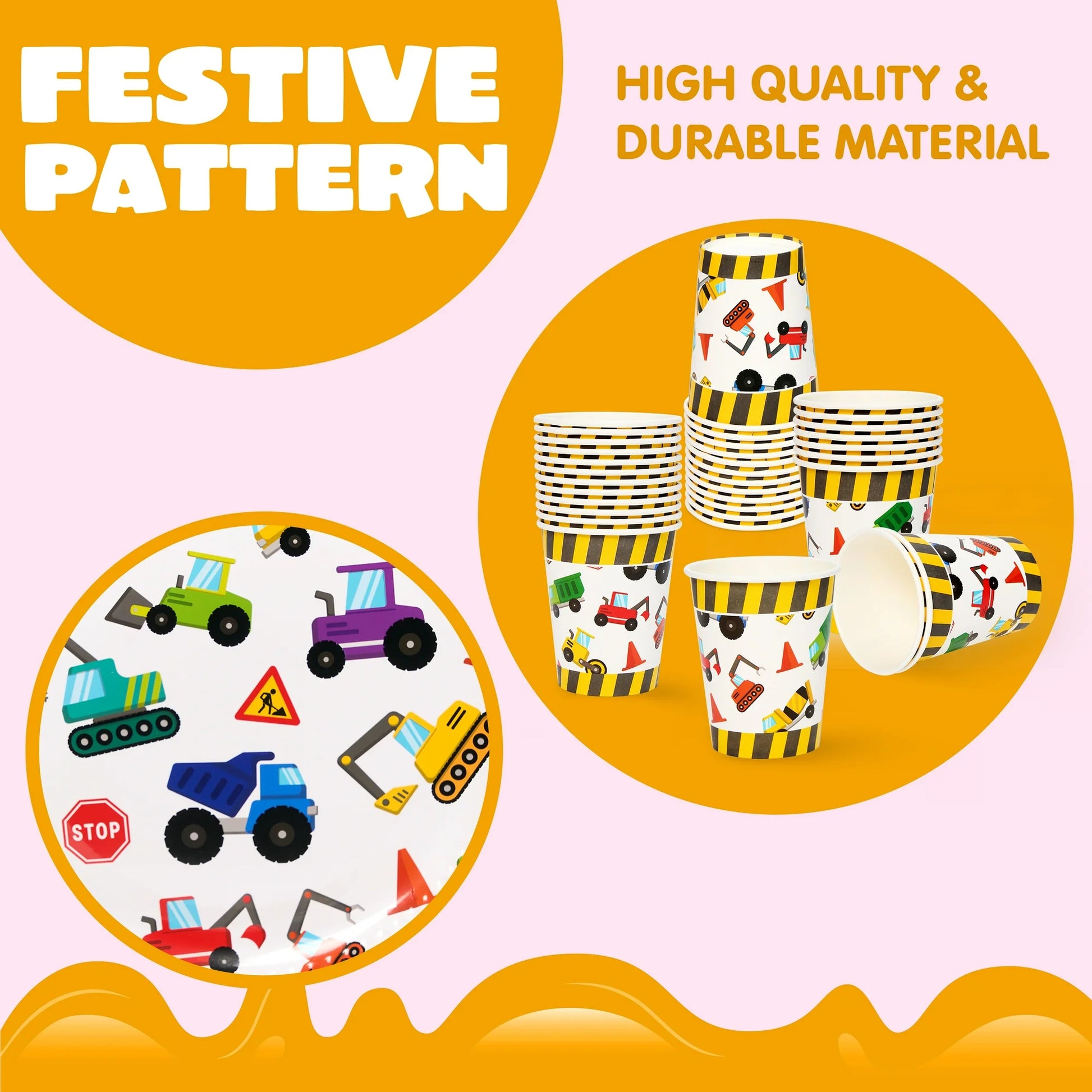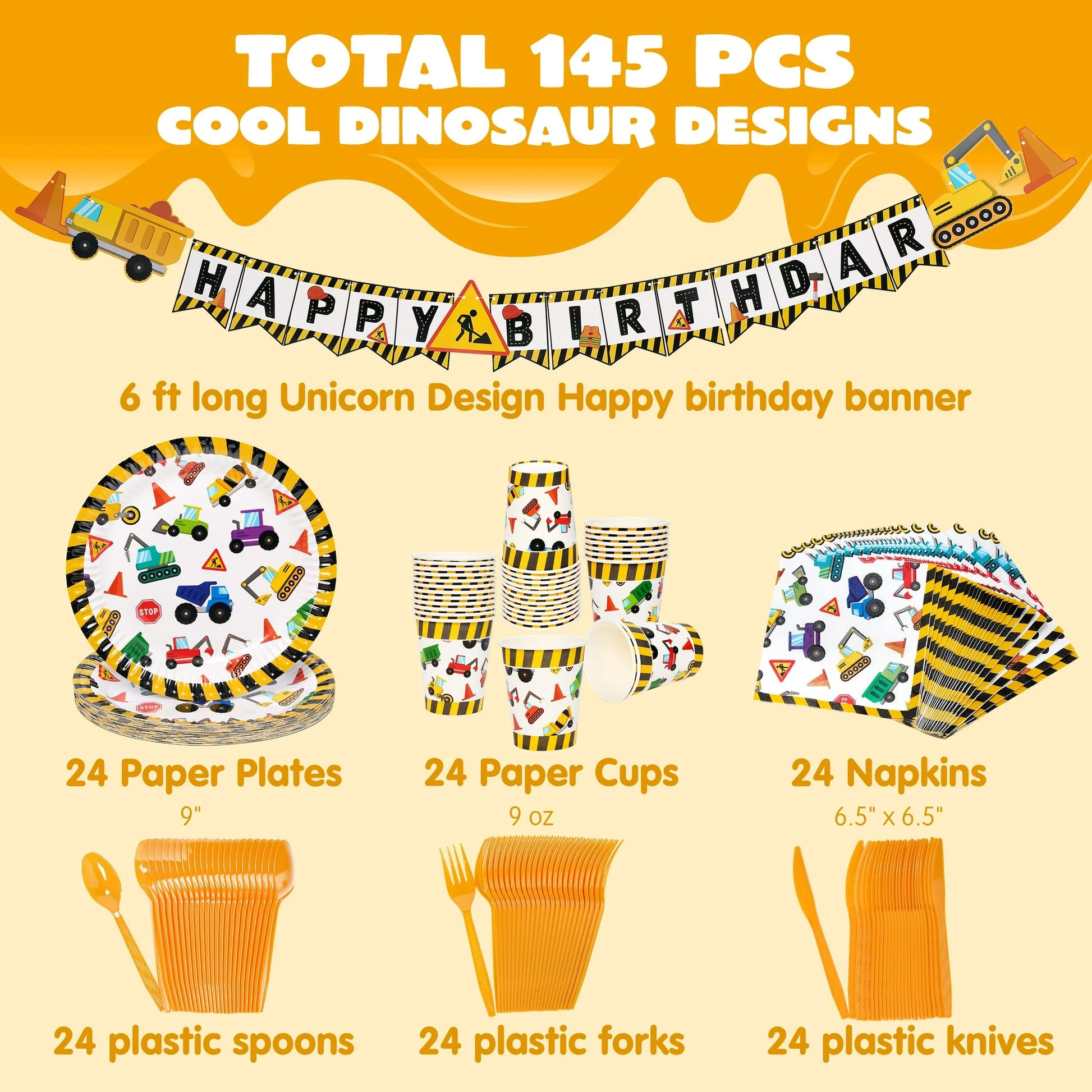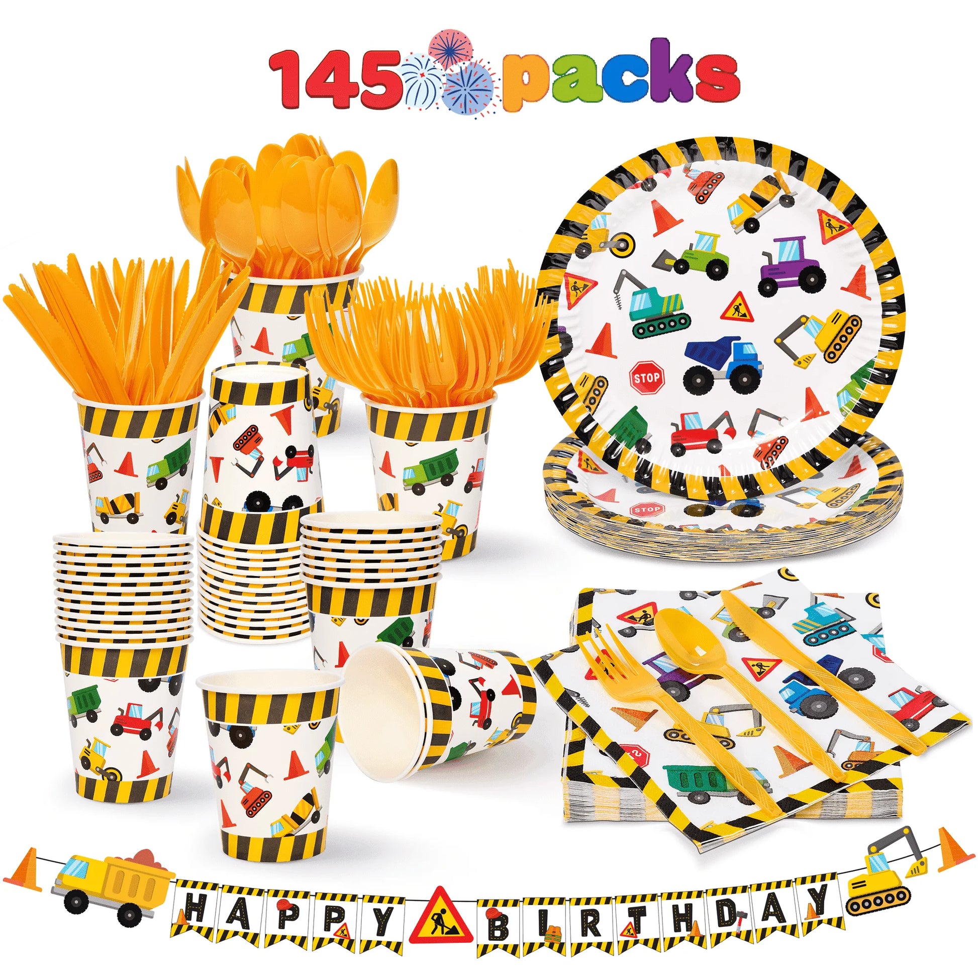 Syncfun 145 Pcs Kids Birthday Party Supplies with Truck Banner 24 Serves Disposable Tableware Set with Plates, Cups, Napkins & Cutlery, Construction Theme Party Decoration for Boys
