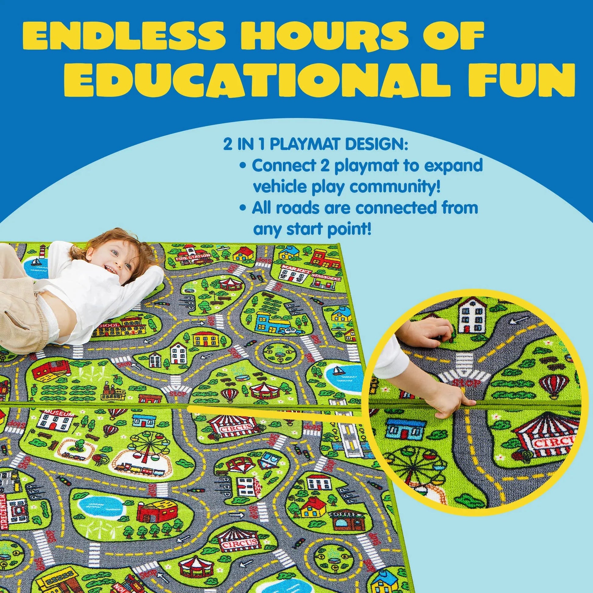 - COMPREHENSIVE SET. Syncfun 2 Pack playmat city life carpet playmat includes two 58.5" x 31.5" carpet play mats .Each play rug has different features and patterns. This City Rug includes a Hospital, a School, a Airport and so much more! Connecting 2 playmats to expand Vehicle Play Community! All Roads are connected from any start point!