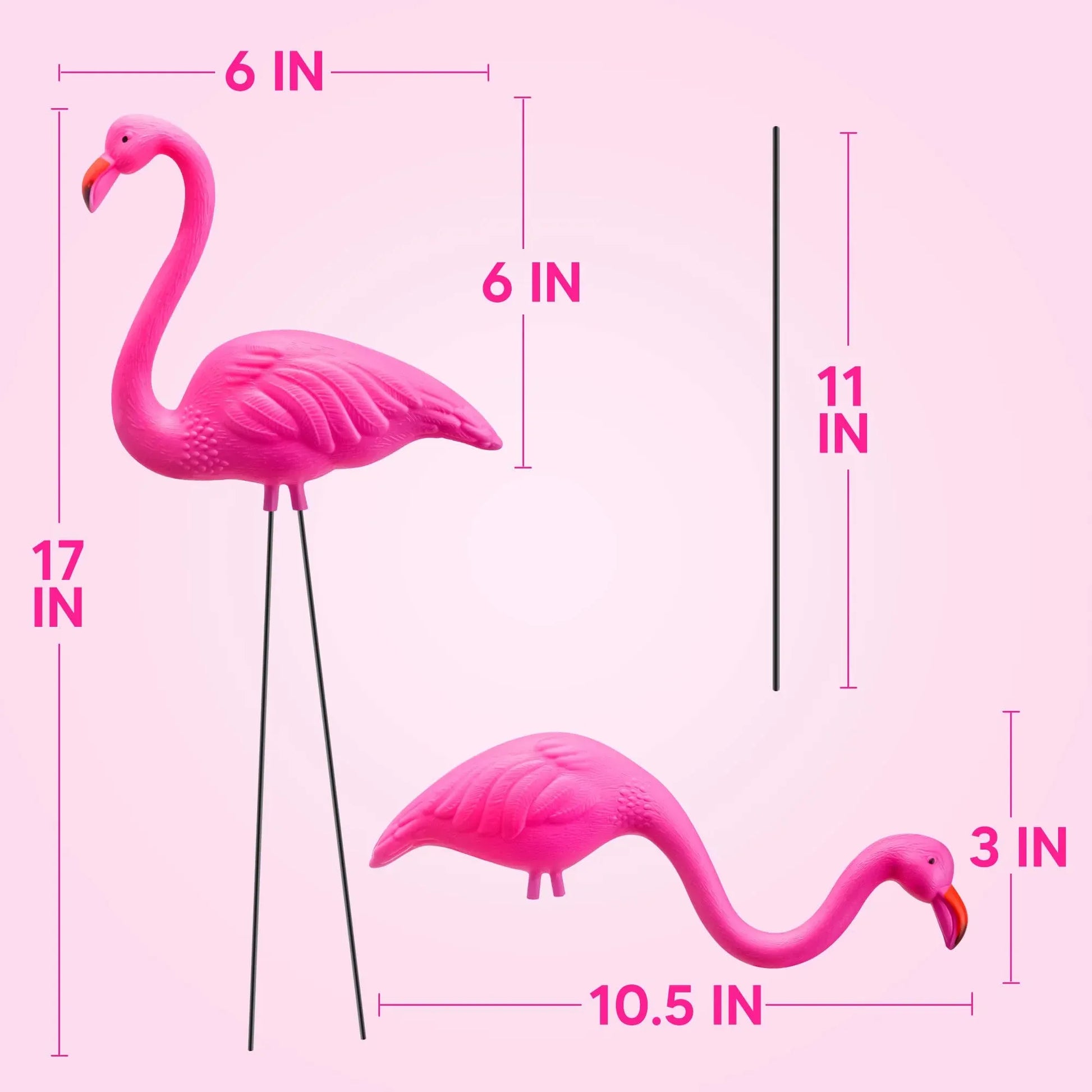 - SUPER VALUE: Syncfun flamingo ornament set includes 2 Small Pink Flamingos. The yard flamingo with a head tilt high measures 17in height x 6in width, while the one with the head down measures 14in height x 10.5in width. Both flamingos have galvanized steel legs and 2 eyes for each one.