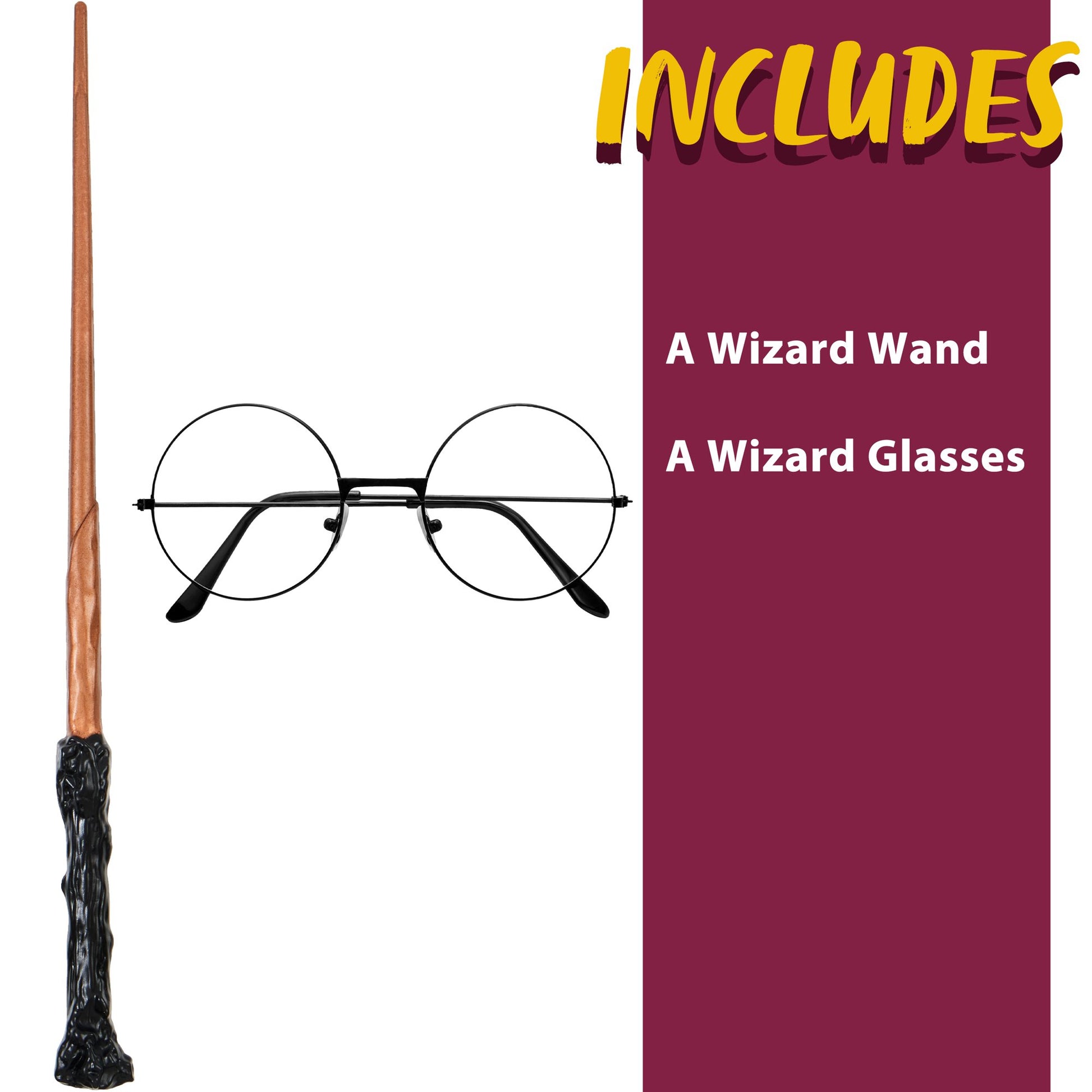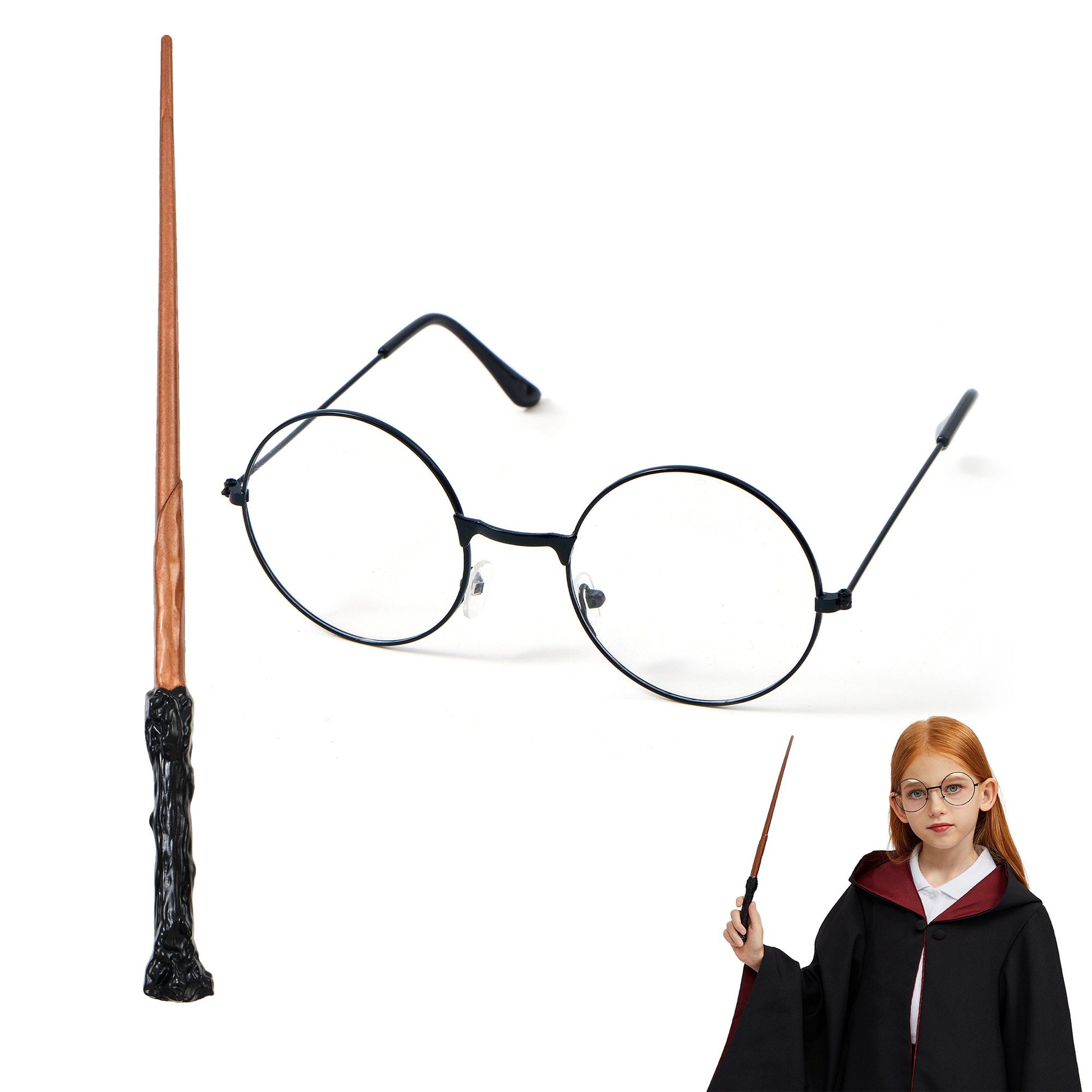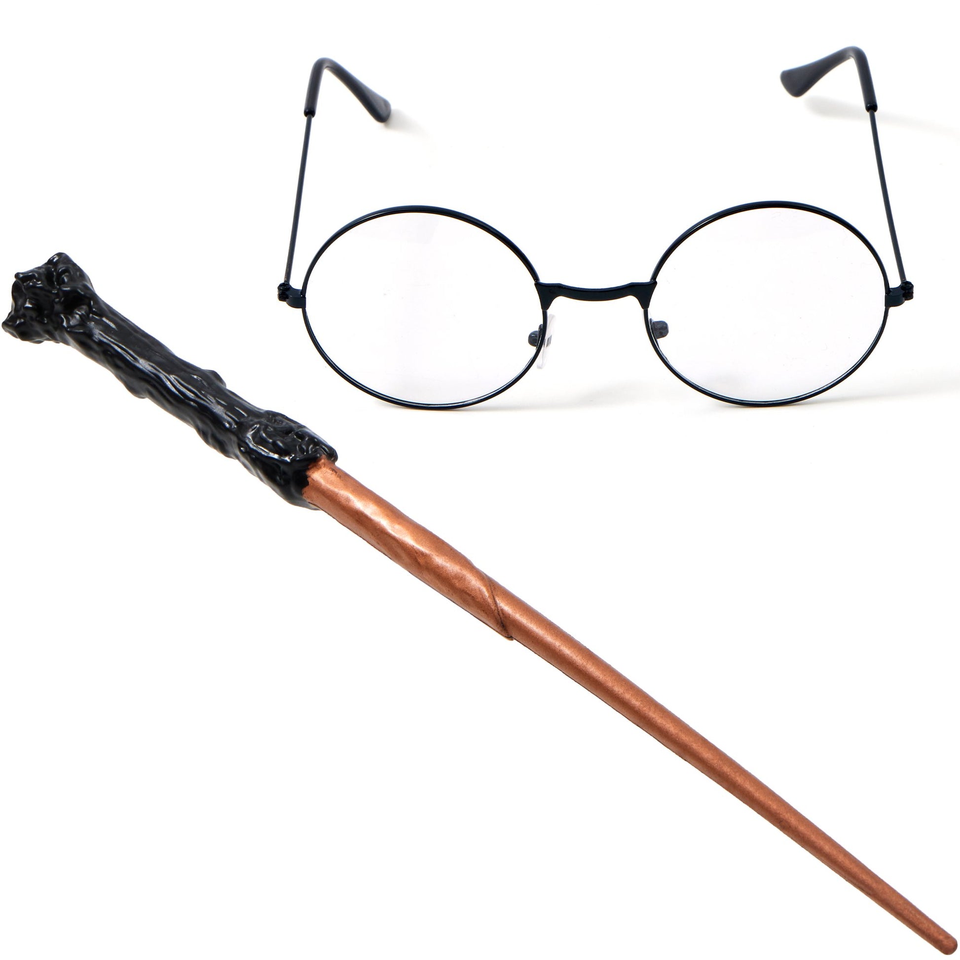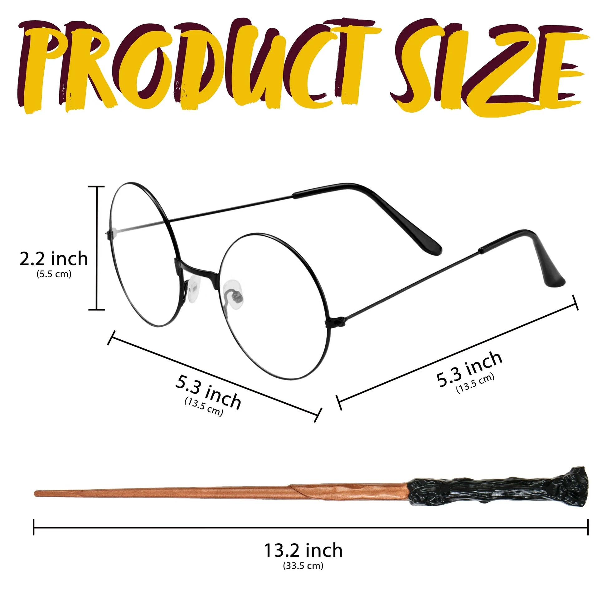 - This Witch Costume Accessories Set comes in 2 pcs witch props, including a black fake nerd circle anime glasses,and a wizard wand for kids and adults.