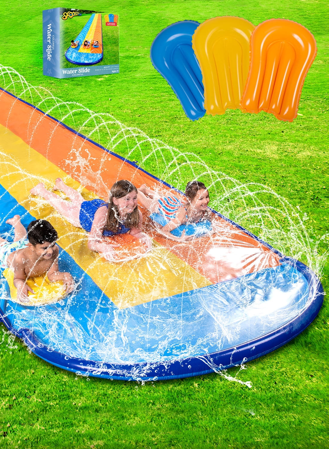 - SYNCFUN Triple Lawn Water Slide includes 22.5ft x 80in Triple Lawn Water Slide, 3 inflatable inflatable boards, 21.7" x 16.5", two sides built in sprinkler, 4 ground stakes, featured with end splash pool.