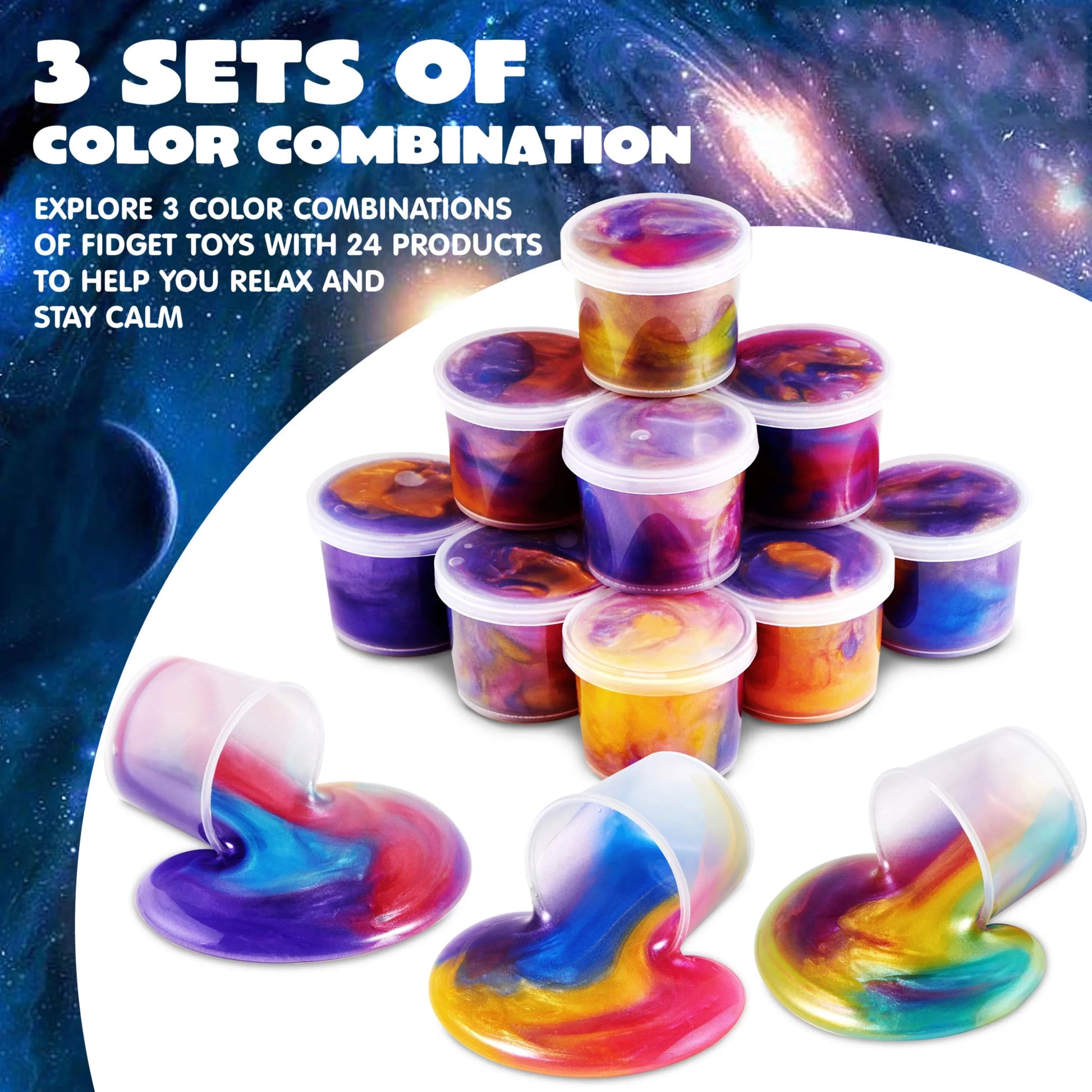 - Get 24 cups of galaxy slime in 3 groups of color combinations that meet all your imagination of the star-studded galaxy.