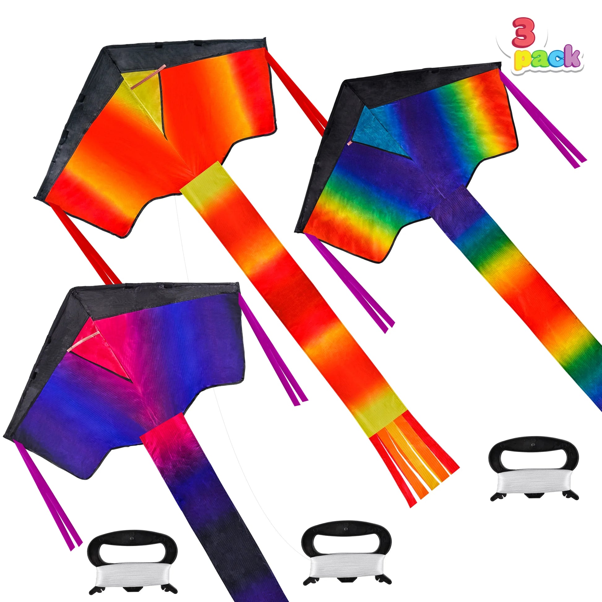 - UNIQUE DESIGN: Syncfun Kites features a soft gradient multi color, a warm gradient color and a cold gradient color that will surely lighten up your mood as it flies and adds color to the sky. This includes 3 pieces of Nylon Kites 43.3 inch (110 cm) Wide x 23.6 inch (60 cm) long with 57.1 inch (145 cm) Tails and an Assembling Instruction Guide. The kite handle string is 262.5 ft with 32 inch .