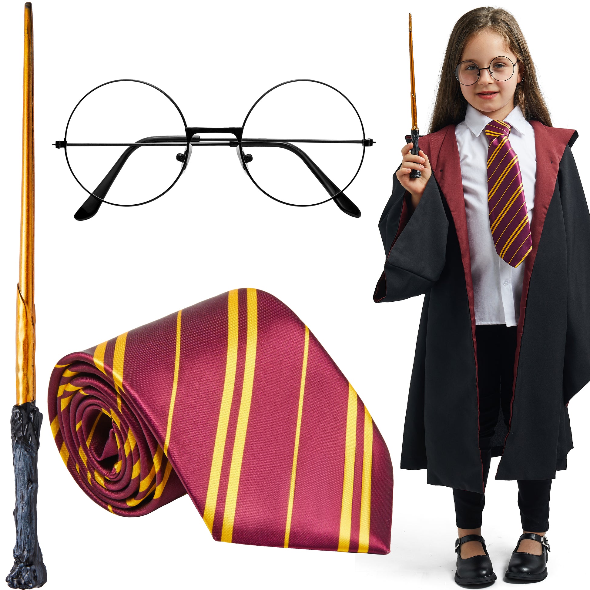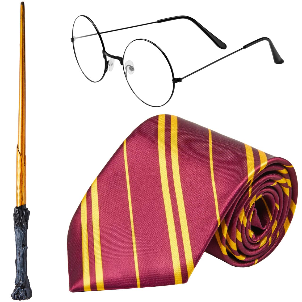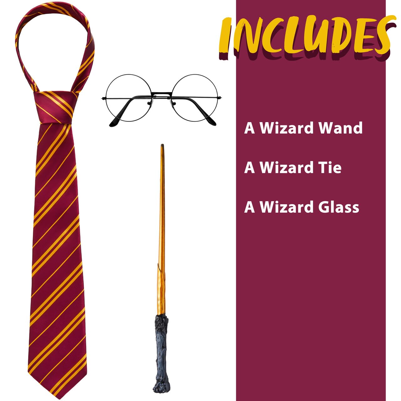 - WITCH AND WIZARD ACCESSORY SET: Complete your magical transformation with these essential accessories, including black wizard glasses, a stylish maroon and yellow tie, and a wand to cast your spells.