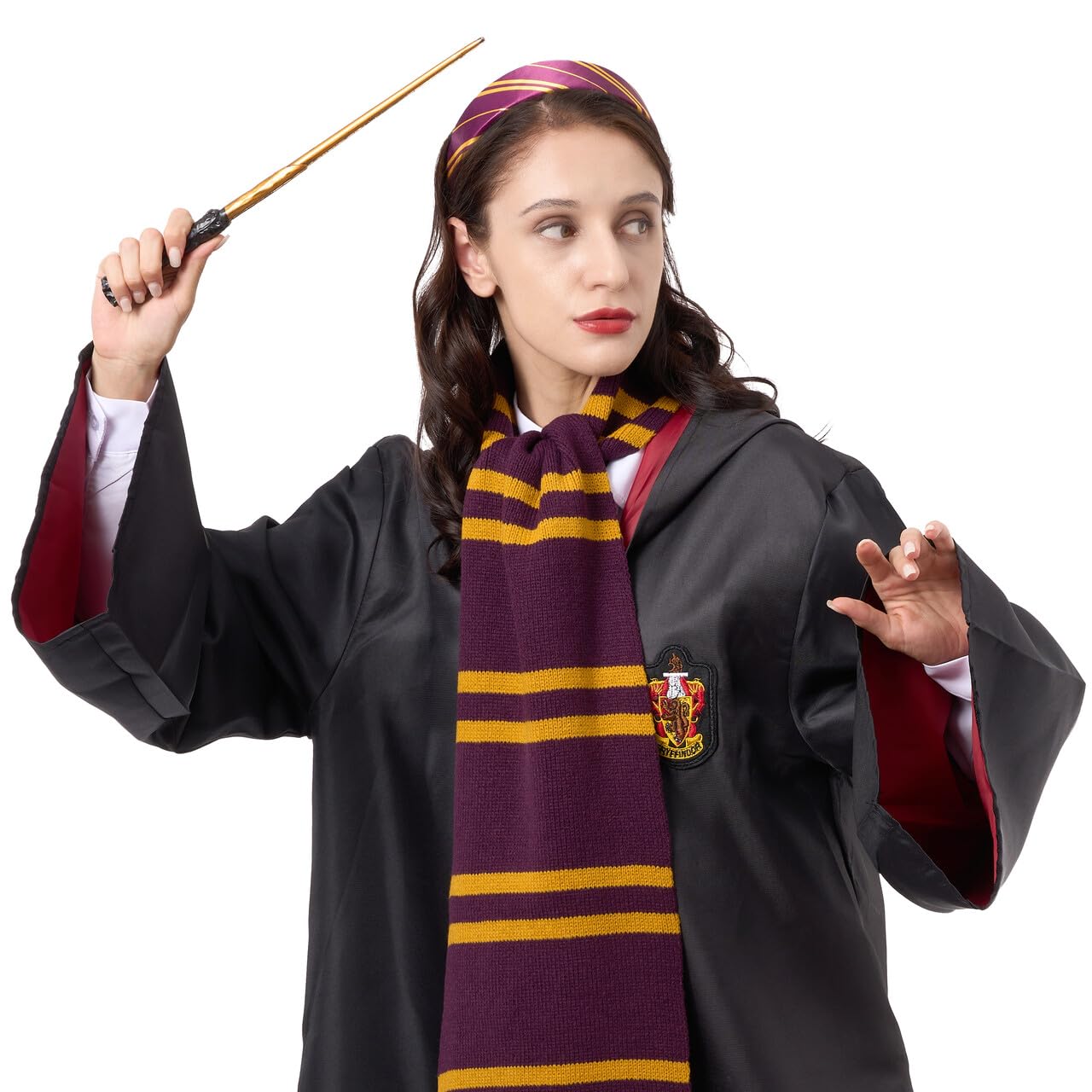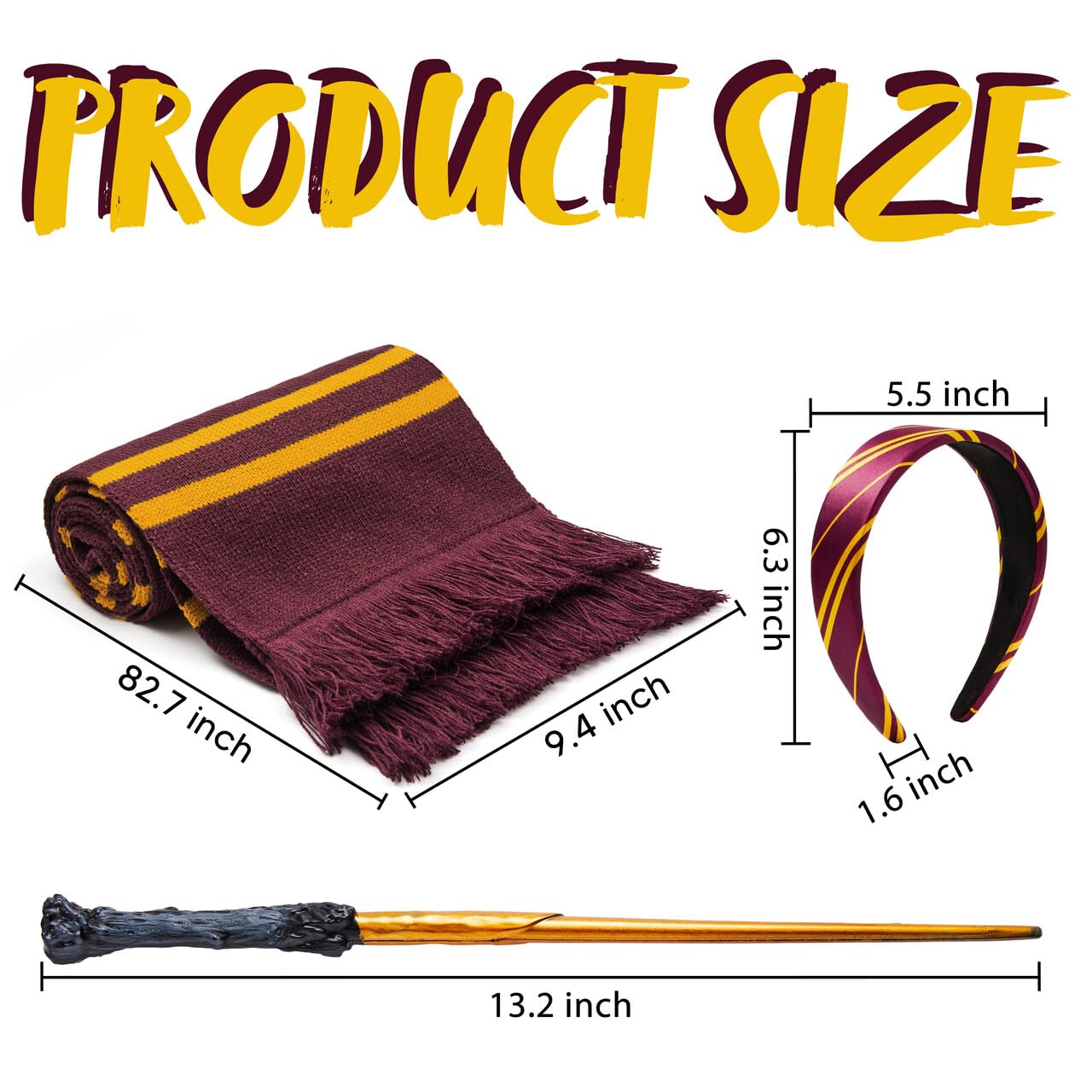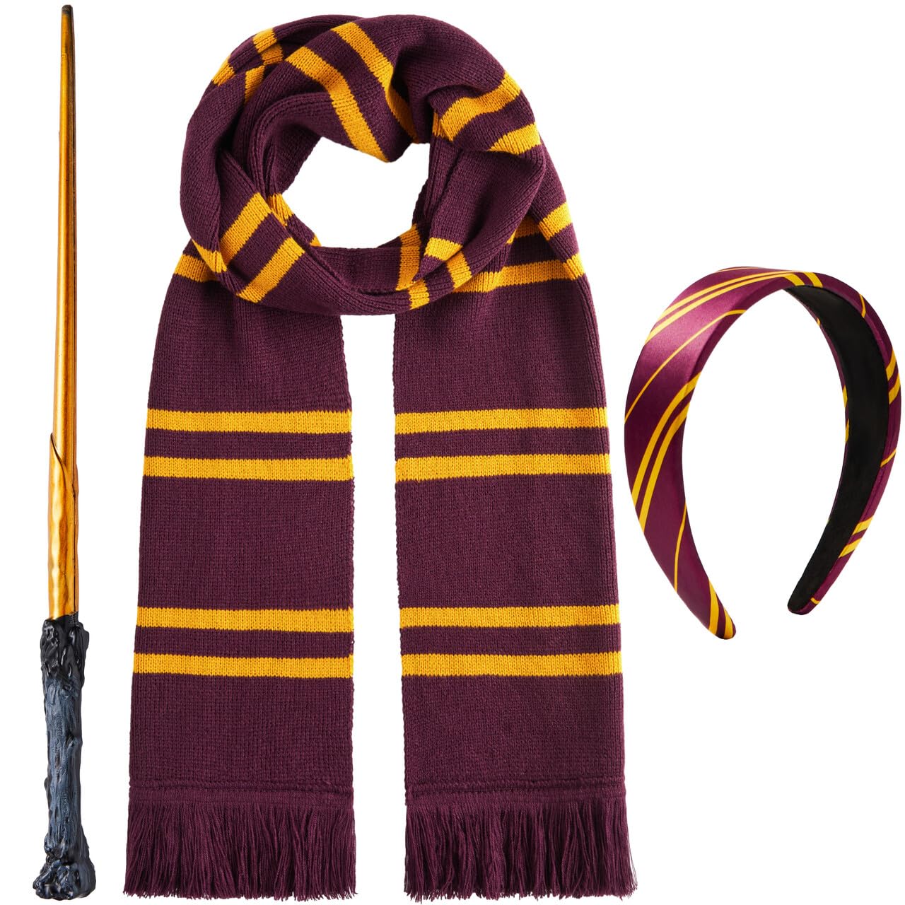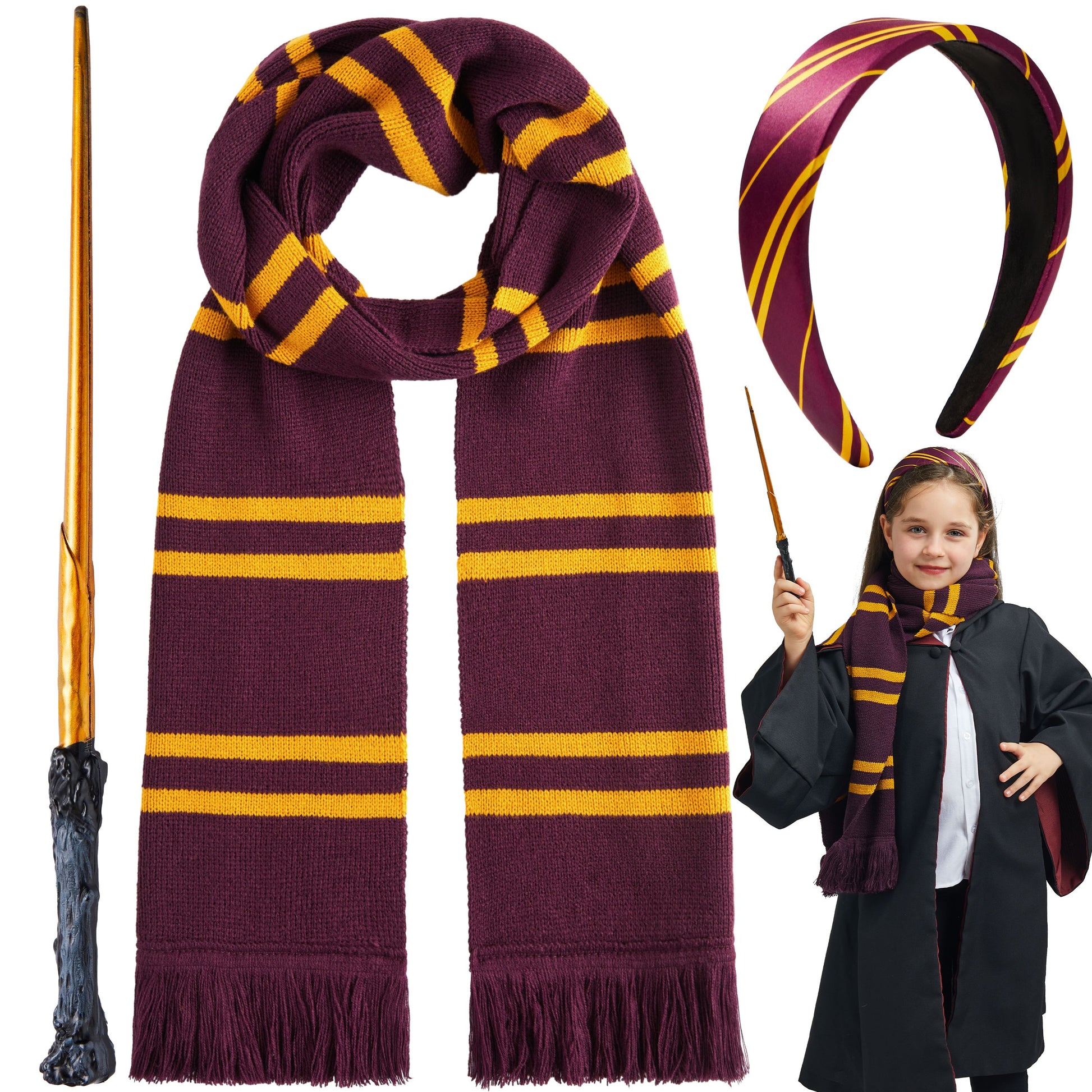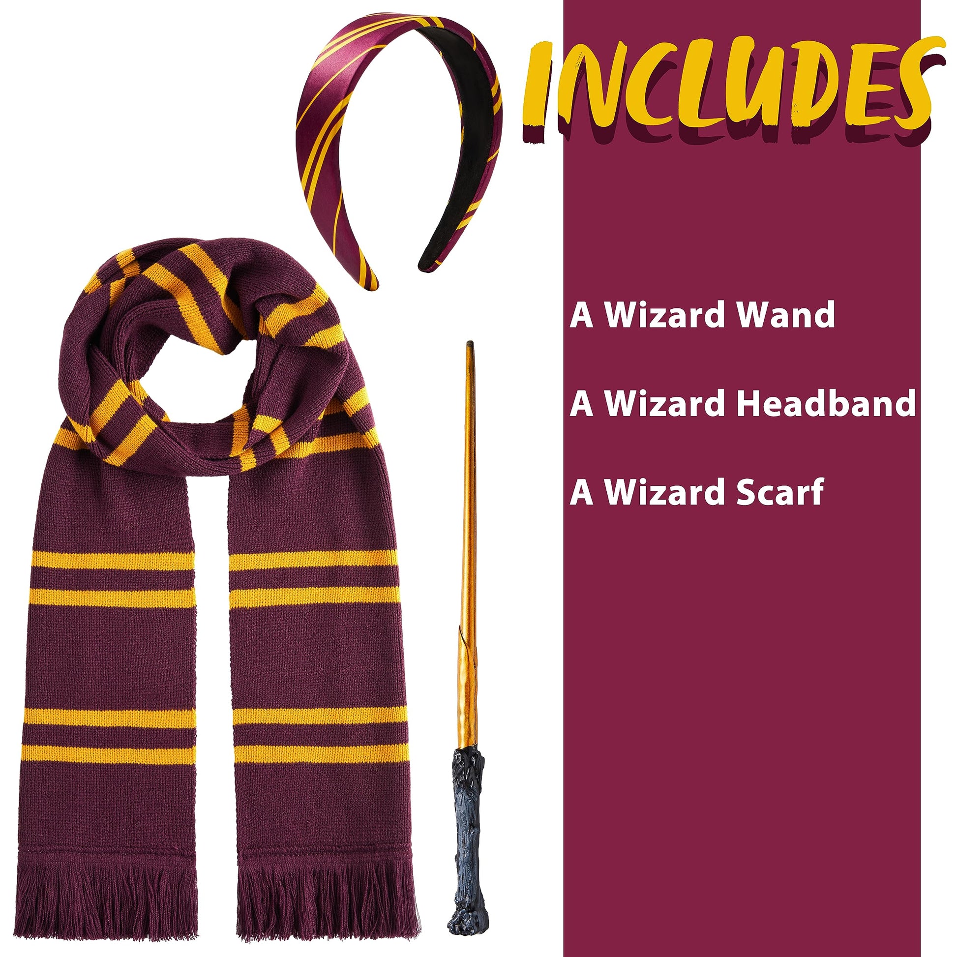 - WITCH AND WIZARD ACCESSORY SET: Complete your magical transformation with these essential accessories, including black wizard glasses, a stylish maroon and yellow tie, and a wand to cast your spells.