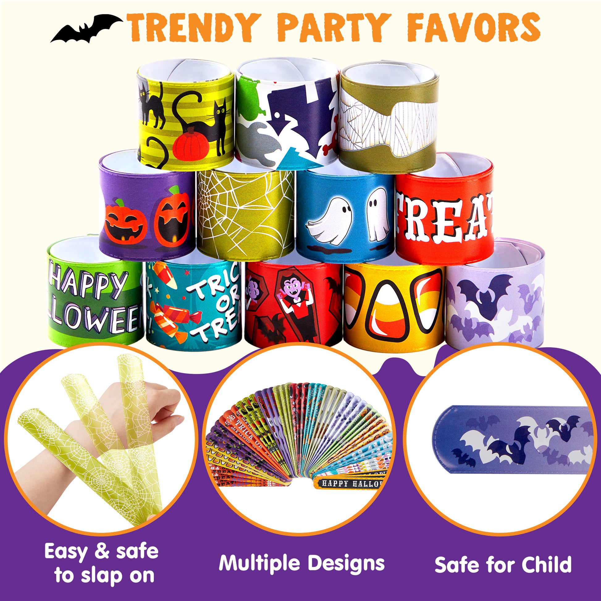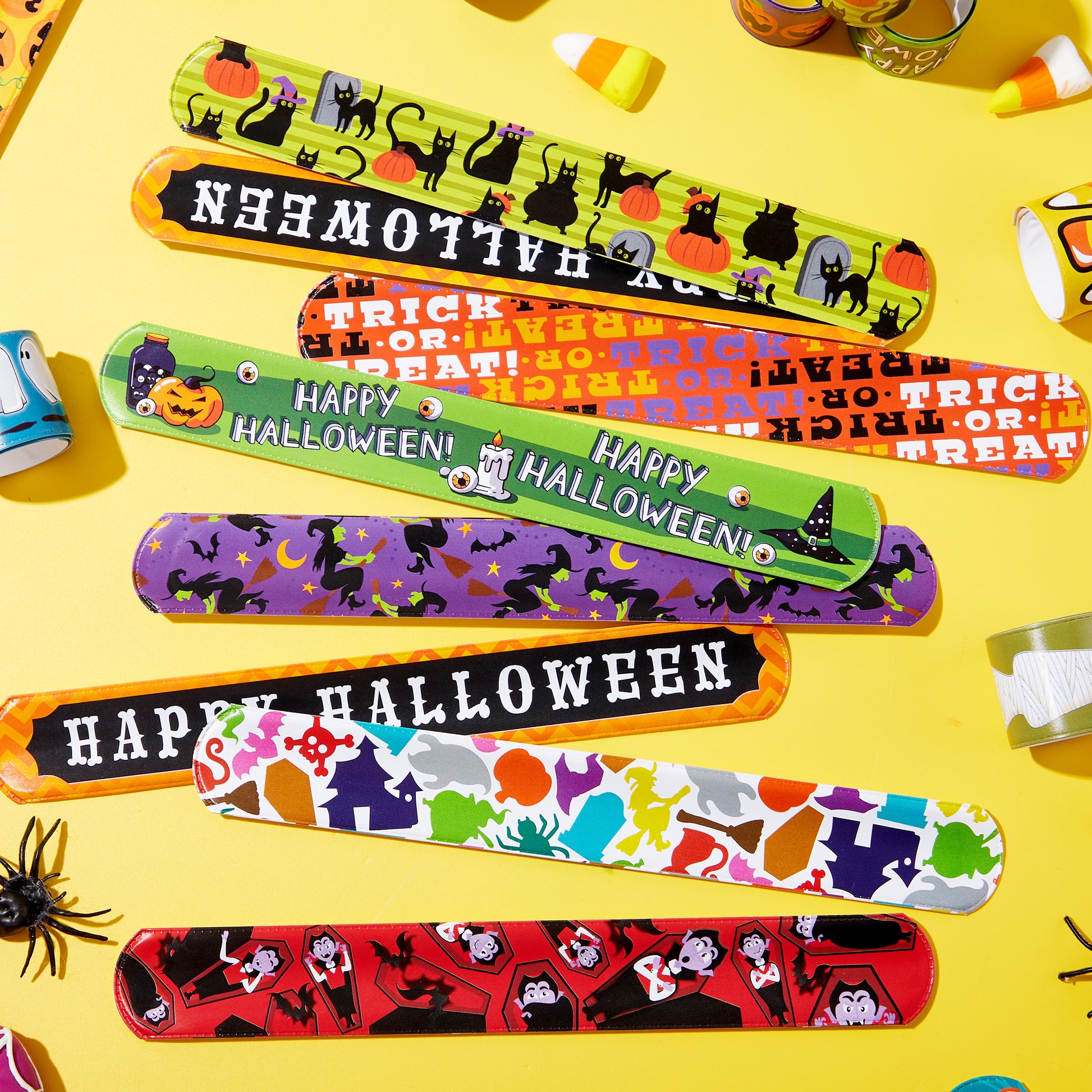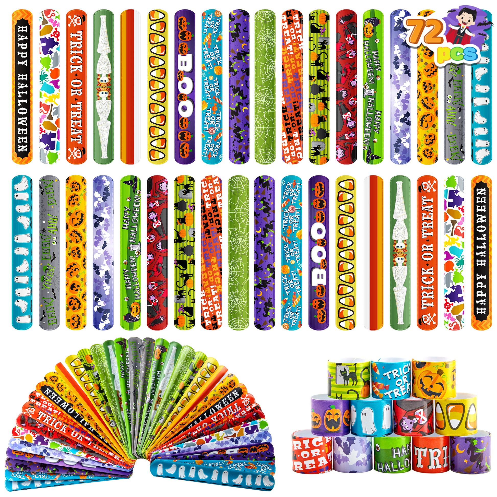 - The slap bracelets set includes 72pcs Halloween Slap Bracelets. It includes 72Pcs Halloween pat ring wristband in 18 different style,such as ghost, pumpkins, witches, bats, mummies, vampires, black cats, etc.many kinds of pattern,everyone is free to choose the pattern they like.