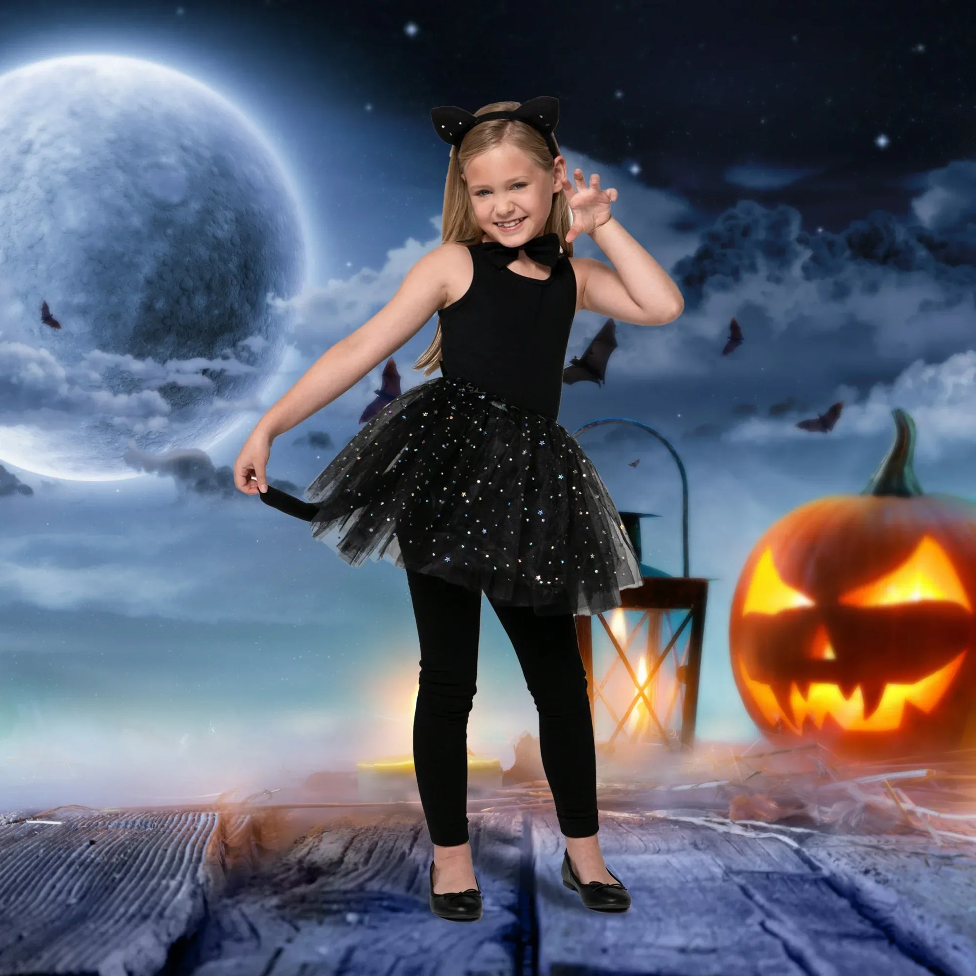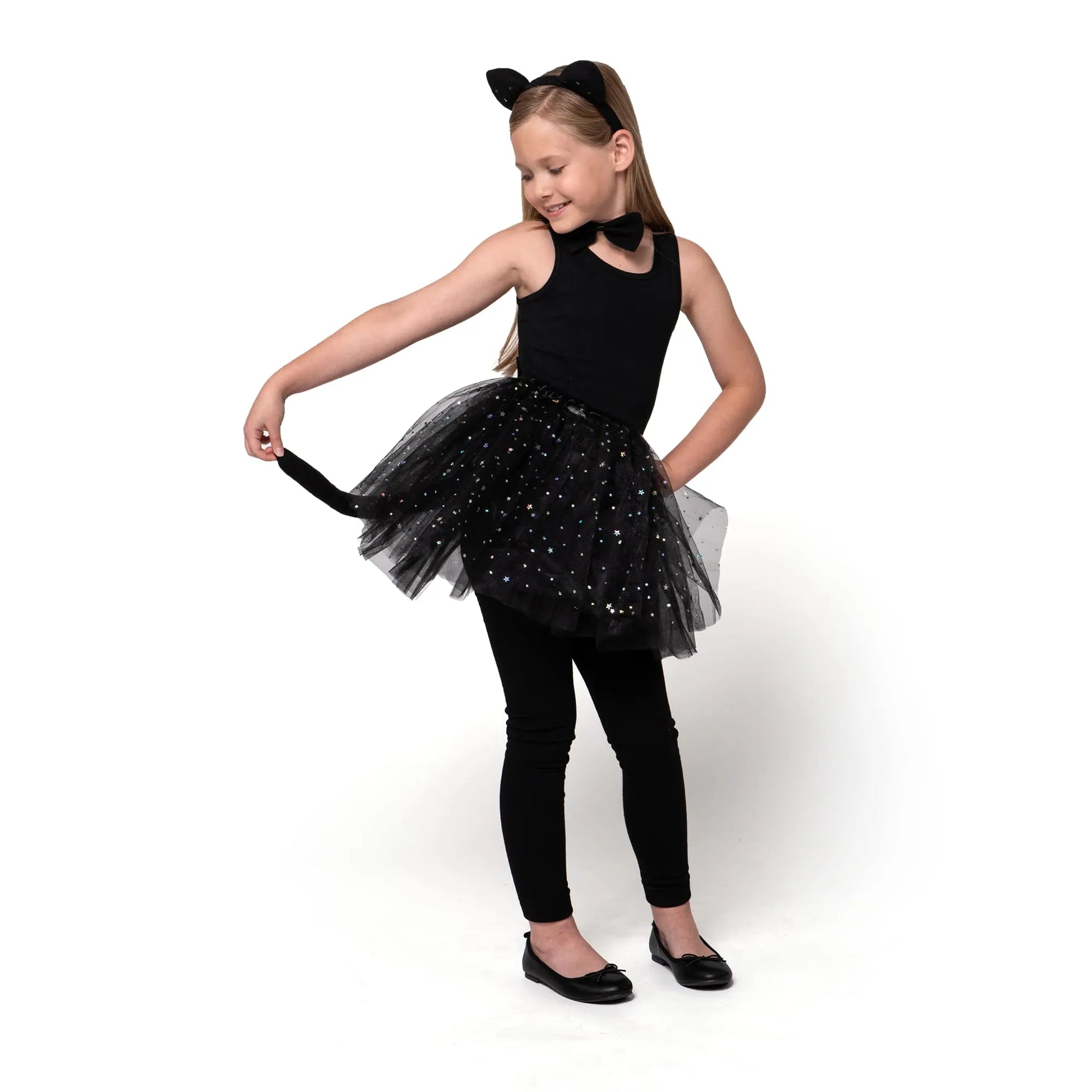 - Unique Design: Complete the look with a shimmering silver foil tutu, cat ears headband with sparkly glitter design, collar and black adjustable cat tail.