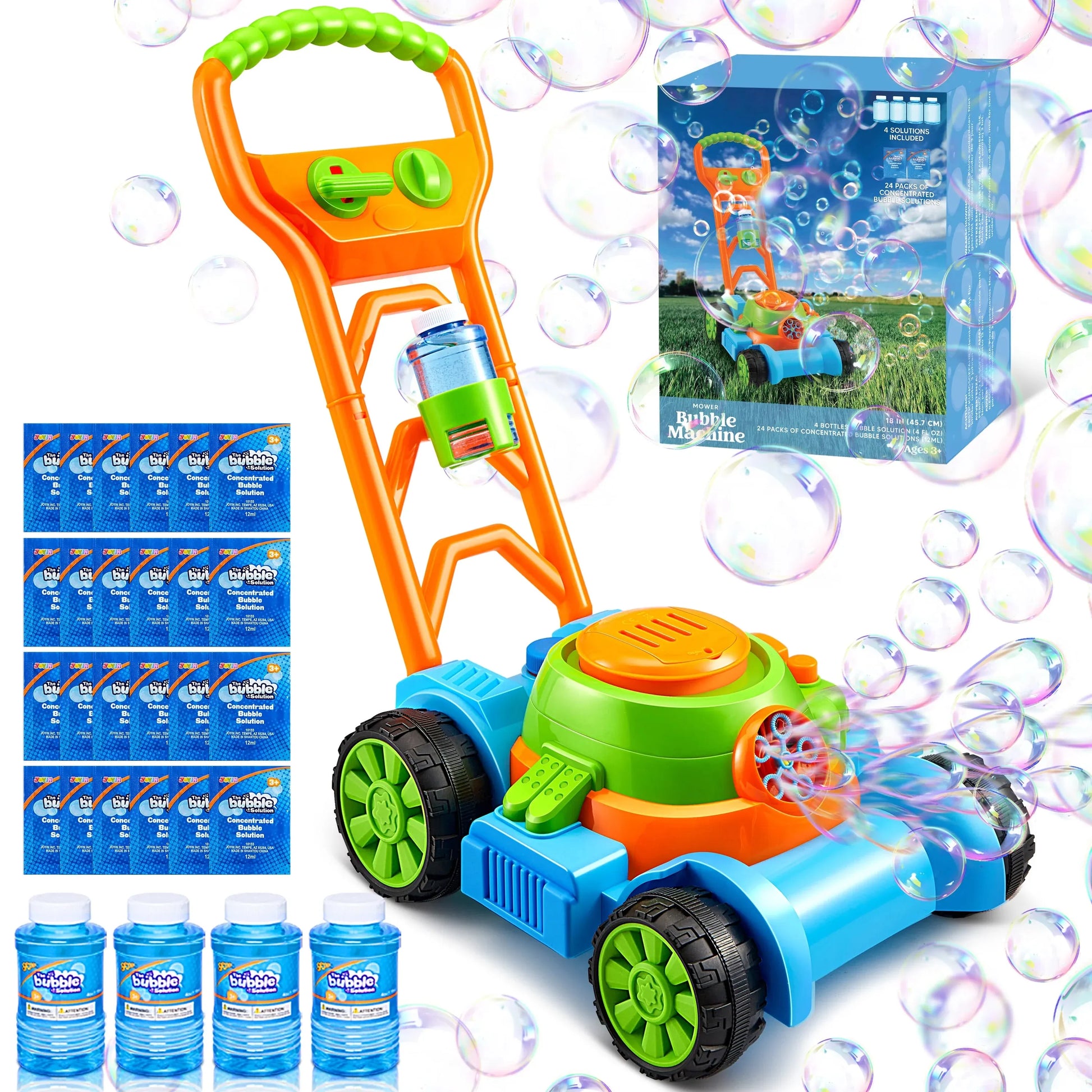 - This bubble lawnmower toy not only blows bubbles but also produces authentic sounds, including gear sounds when pushed on its wheels.