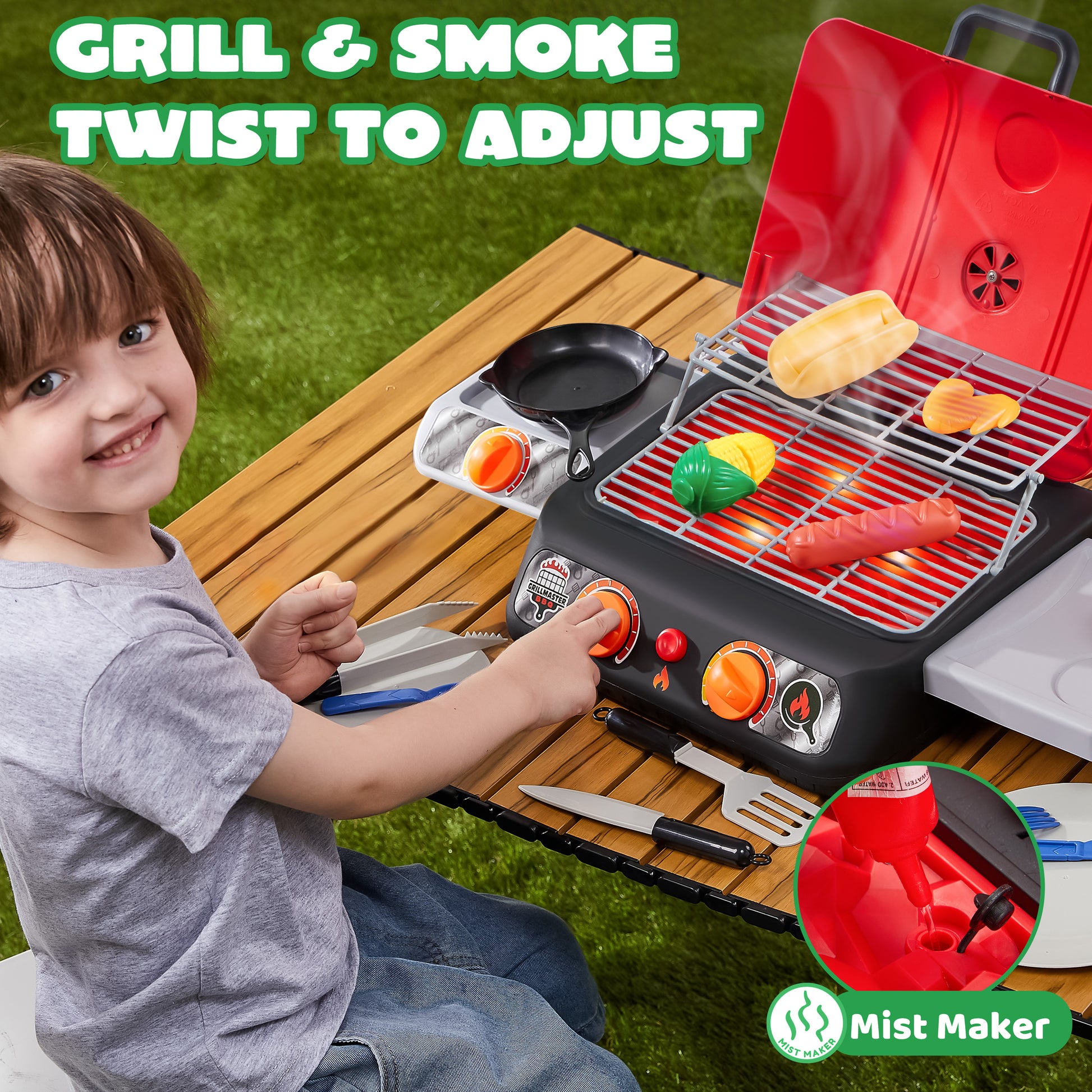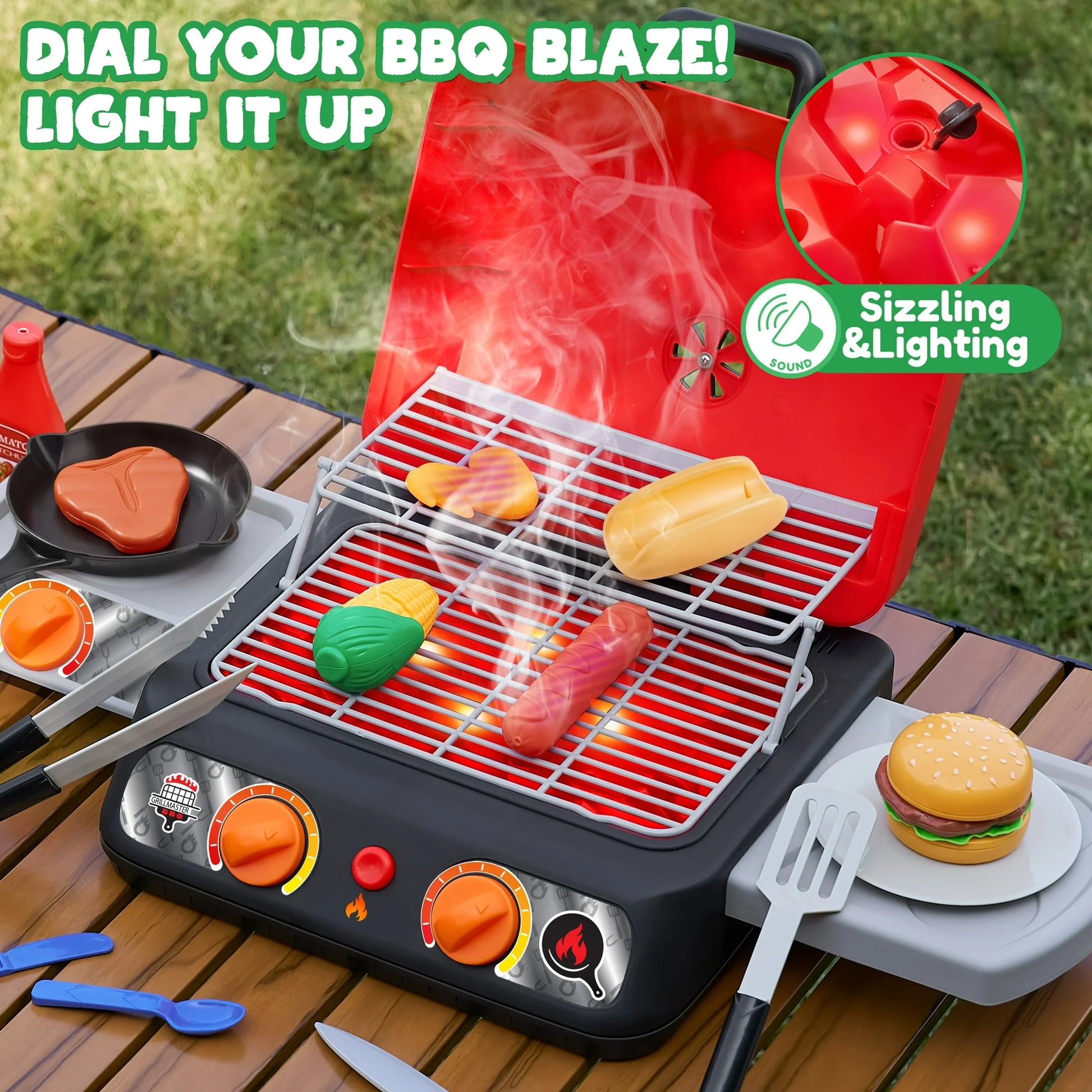 - A built-in mist maker generates safe smoke, while LED lights and crackling sounds recreate a real BBQ atmosphere.