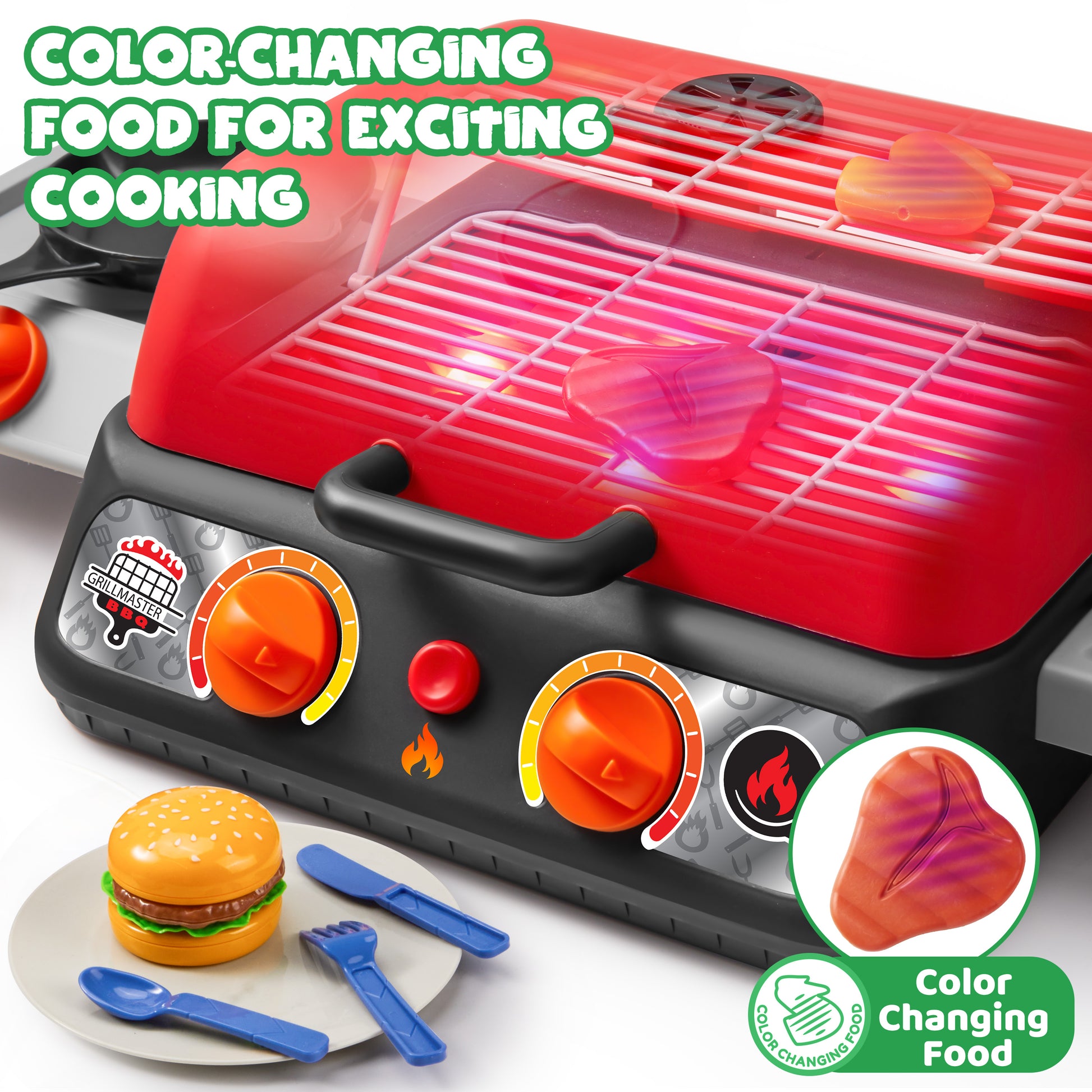 - Our grill set includes color-changing food items that switch from raw to cooked.