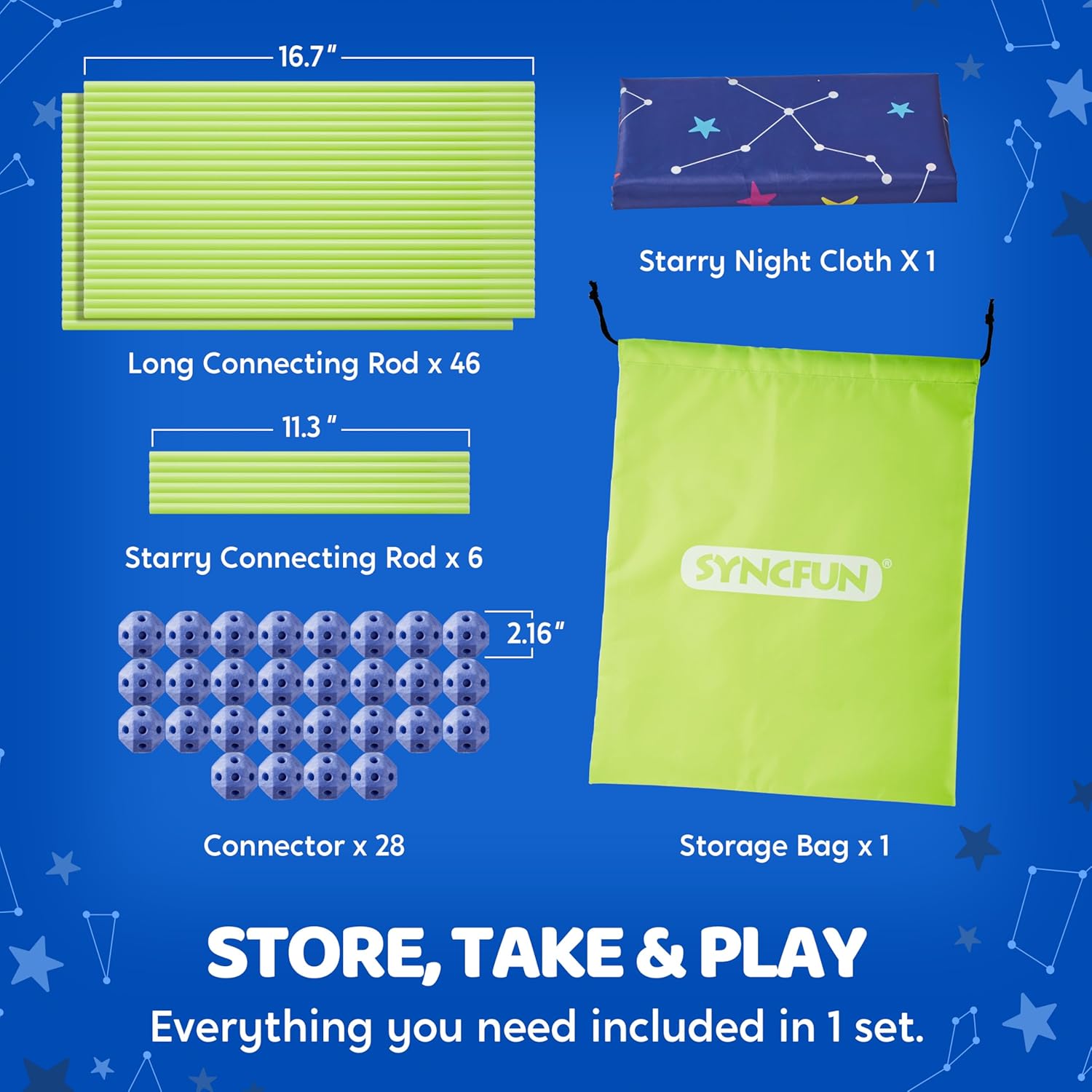 - Glow-in-the-Dark Fun: The rods of this fort building kit glow in the dark, providing a cool castle experience for kids. In light environments, they appear light green; in dark environments, they glowing brightly. Combined with the star cloth, it creates an enchanting play space. Suitable for a blanket fort building kit.