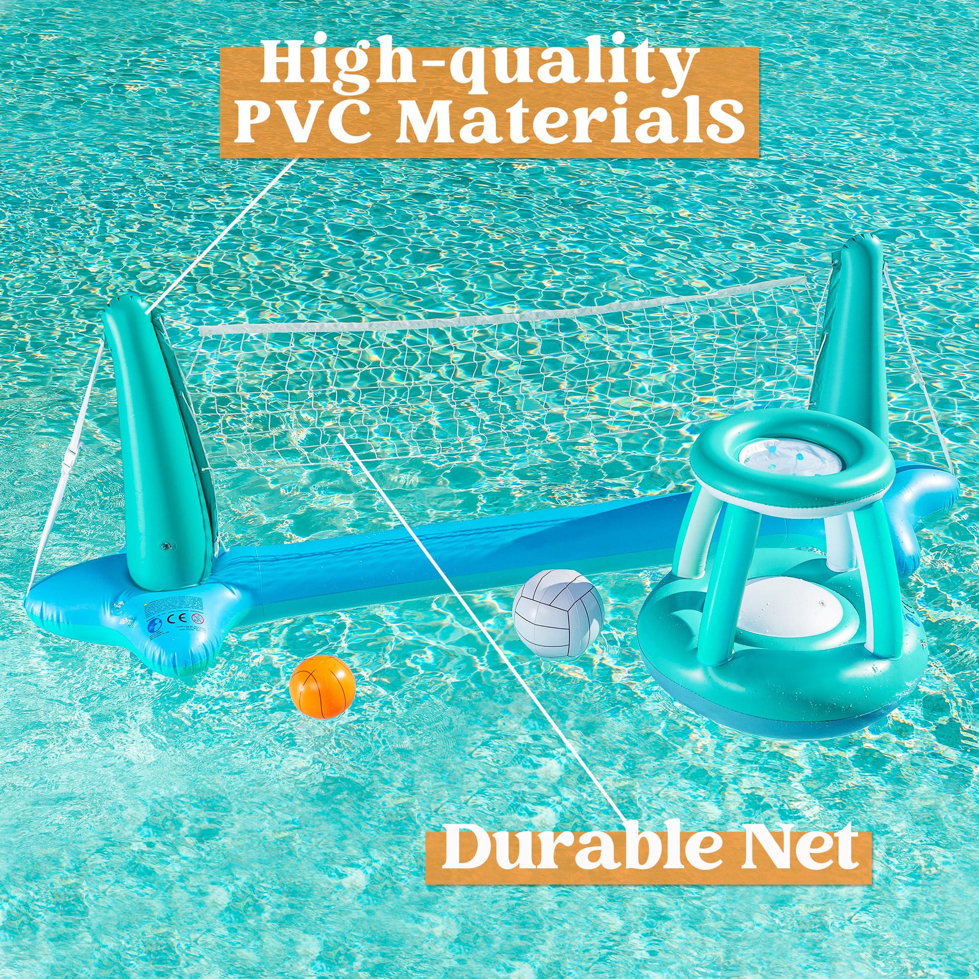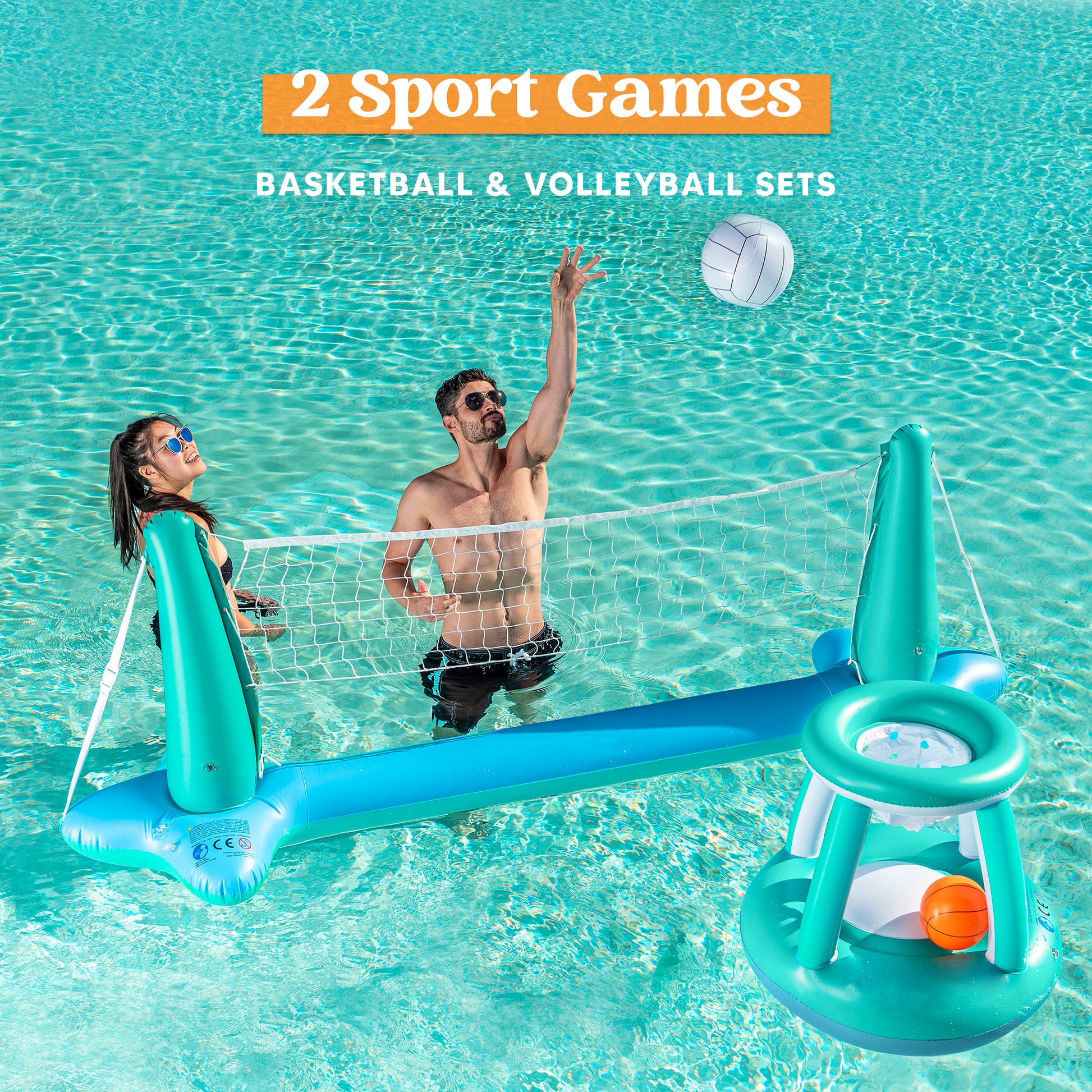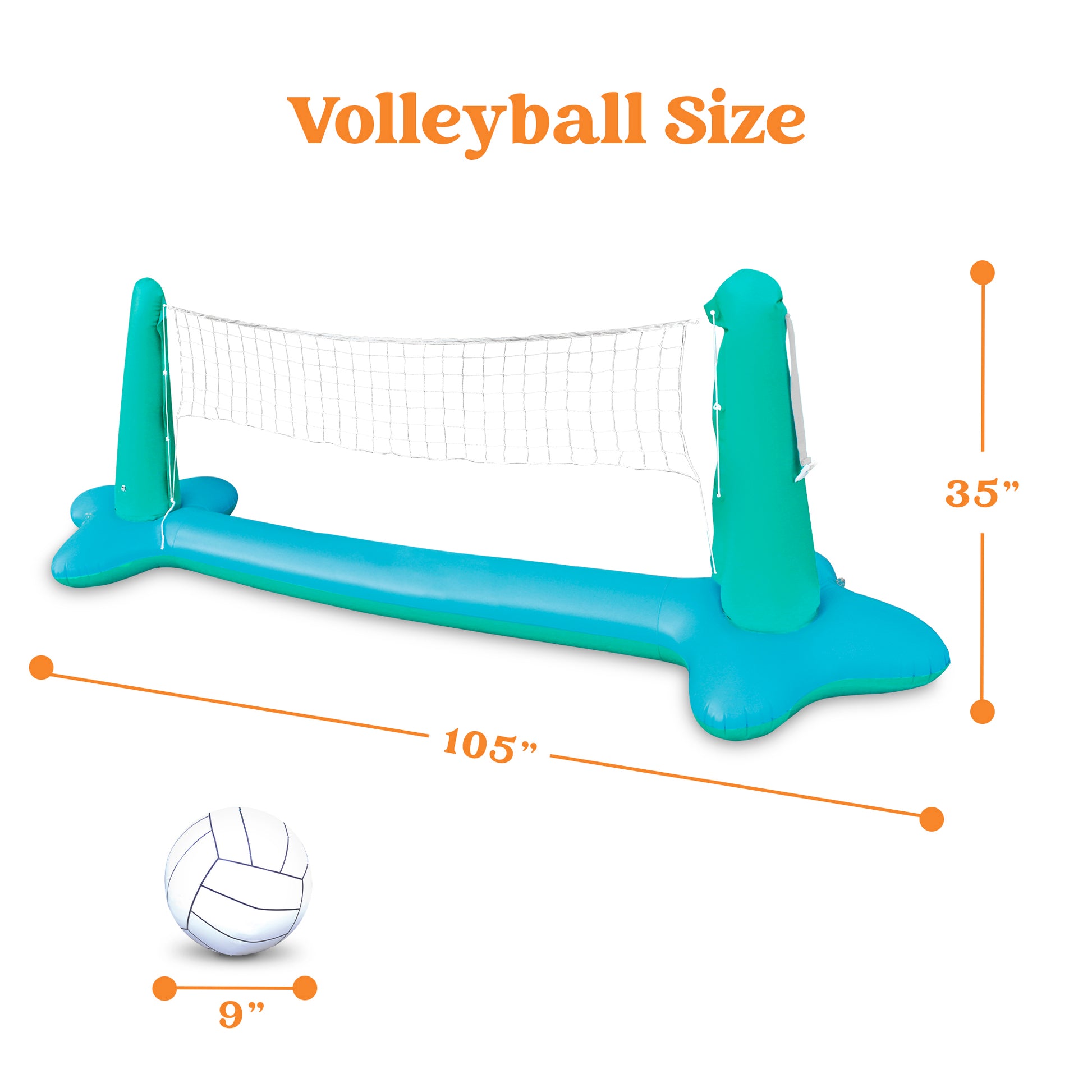 - Inflatable Pool Float Set includes an Inflatable Volleyball Court with 2 Weight Bags, an Inflatable Basketball Hoop, an Inflatable Volleyball, and an Inflatable Basketball.