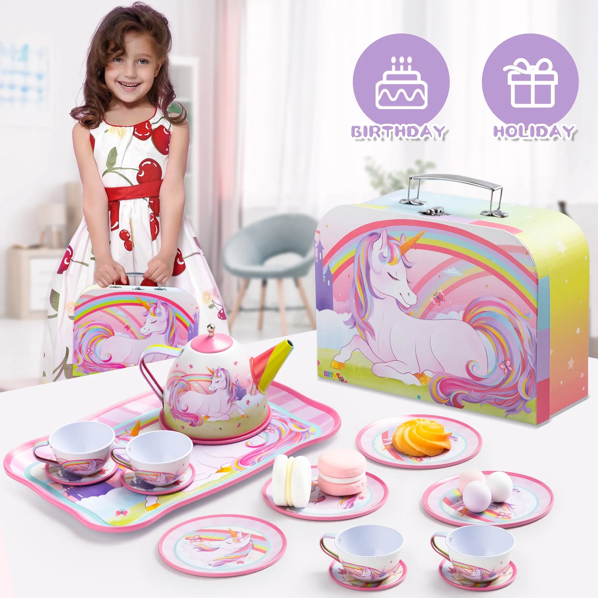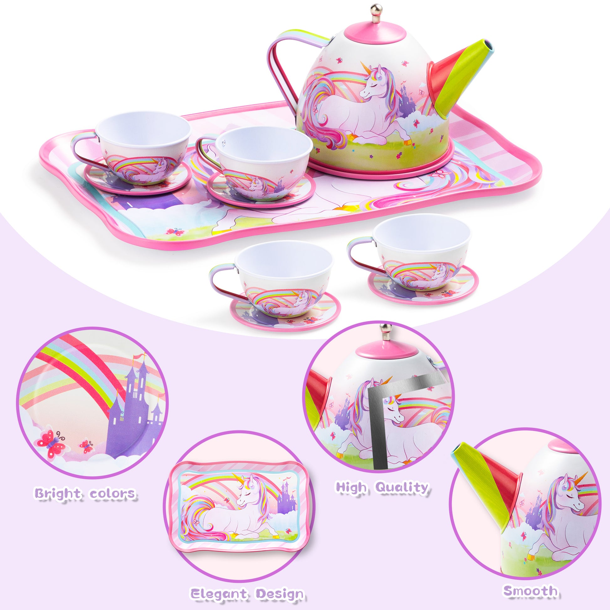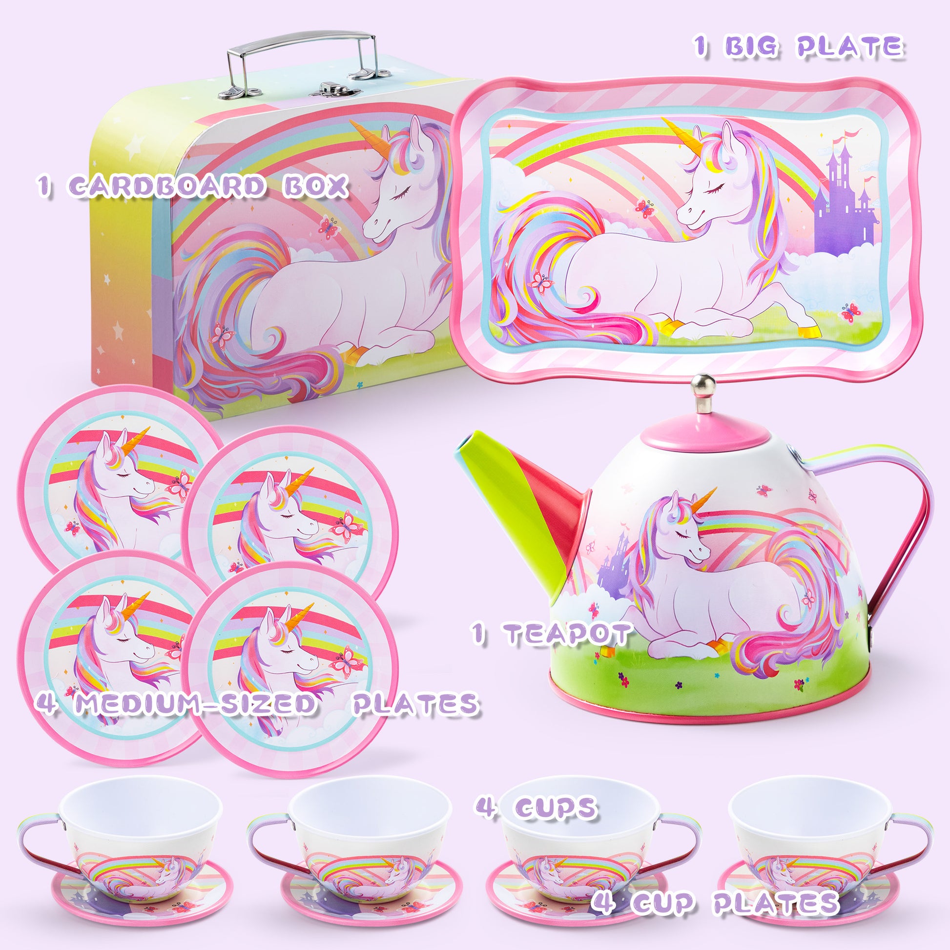 - The tea set is decorated with a magical unicorn , rainbow, and other delightful castle. Sure to delight and inspire your little tiny unicorns.