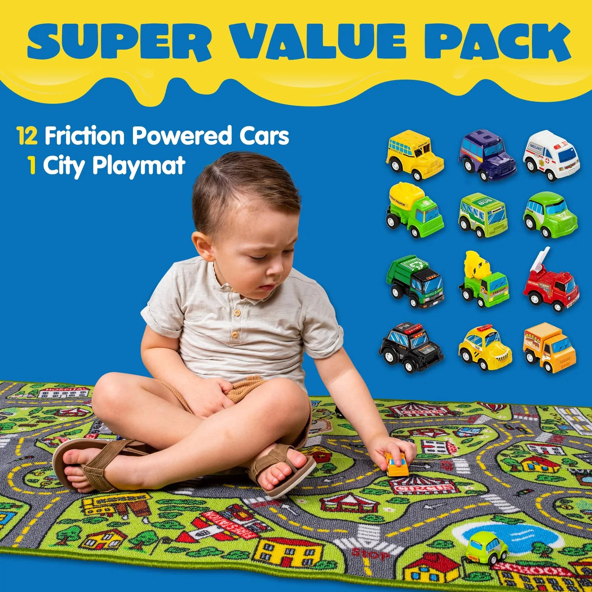 - COMPREHENSIVE SET. Syncfun kids rug includes 58.5" x 31.5" carpet playmat and 12 pieces friction-powered cars, fire truck, police car, transport truck, school bus, ambulance, garbage truck, shuttle, and more. This City Rug includes a Hospital, a School, an Airport and so much more!