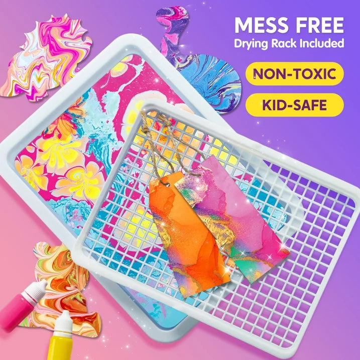 - Mess-free with Drying Rack: SYNCFUN arts and crafts kit includes a perfectly sized drying rack that matches the art tray, effectively containing paint drips and promoting efficient drying of your marbled creations. Enjoy the convenience of hassle-free drying by simply placing your artwork on the rack and maintaining a tidy workspace.