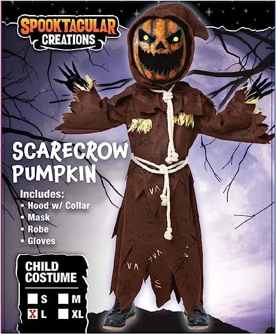 - Wicked Scarecrow Pumpkin Bobble Head Ghoul Costume package Includes Brown Hood with Attached Rope Collar, Evil Pumpkin Mask, Patchwork Dress Robe with an Attached Rope Belt, and Scarecrow Gloves.