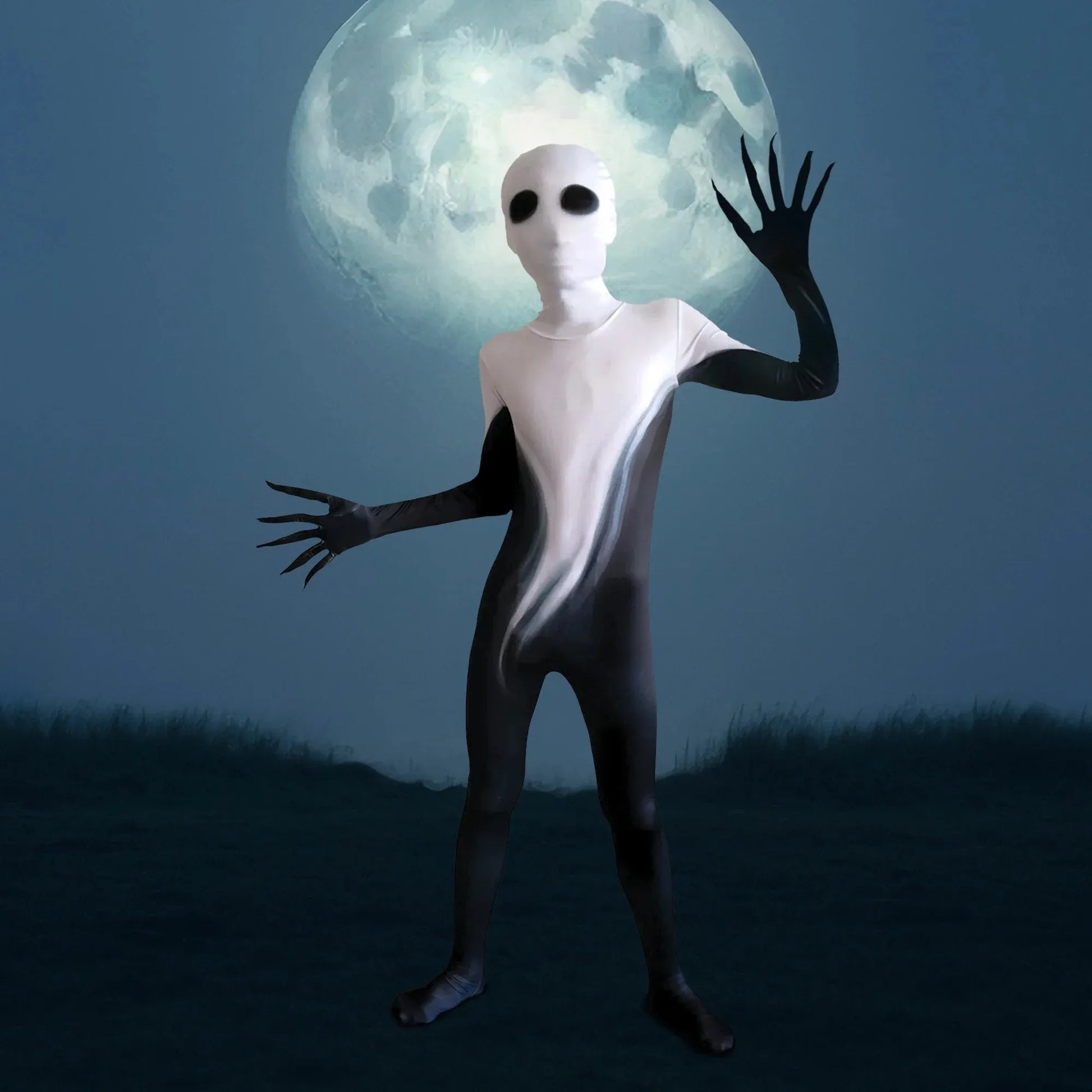- Unisex Kid’s Monster Ghost Costume, package includes Creepy and Stretchy Black and White Bodysuit w/ Zipper On the Back, See-through/Breath-through Hood!