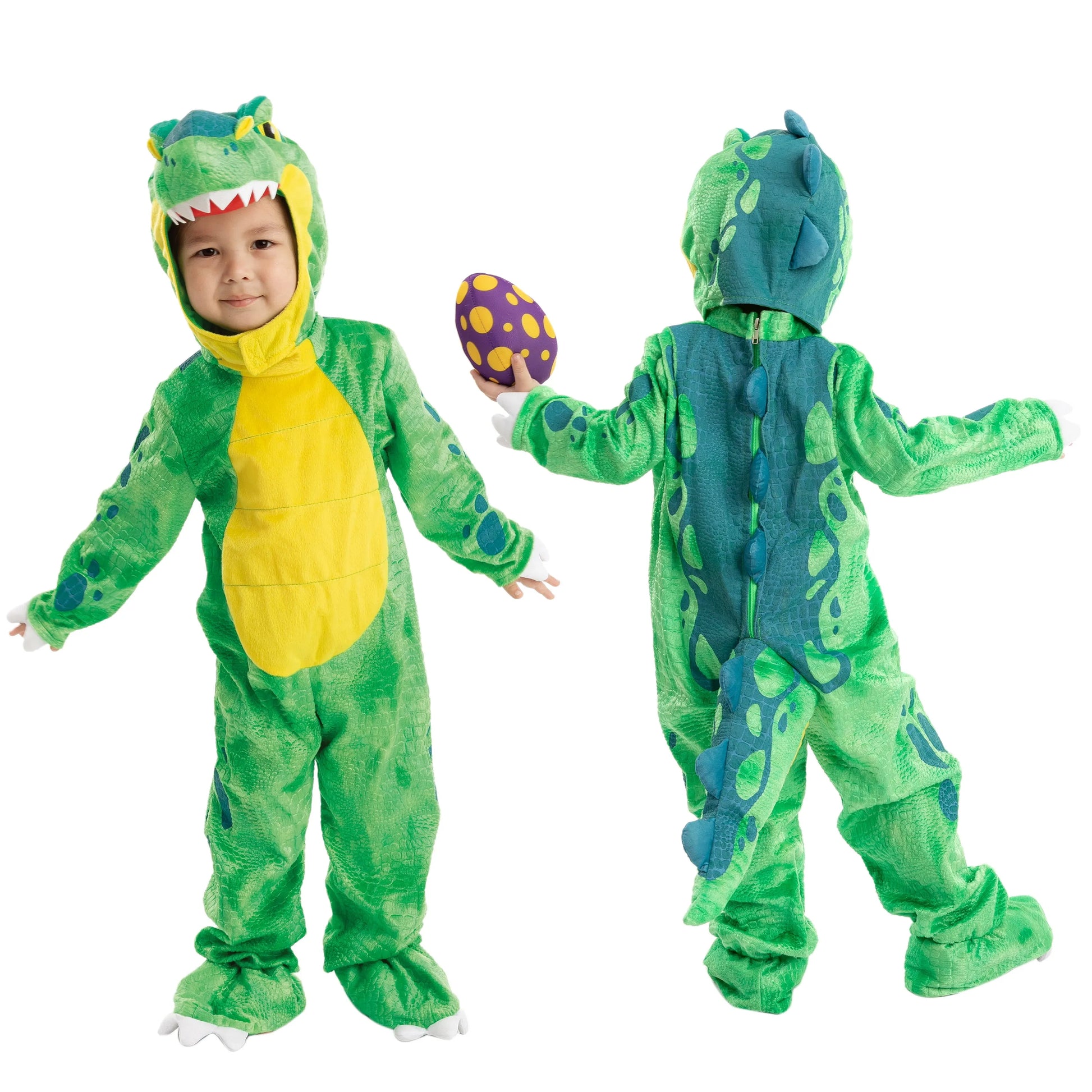- T-Rex Costume for Toddler, Boys and Girls includes a Hood with 3D Dinosaur face, a cute Oange Dinosaur Jumpsuit with tail, a Pair of Booties, and a Fabric Dinosaur Egg.